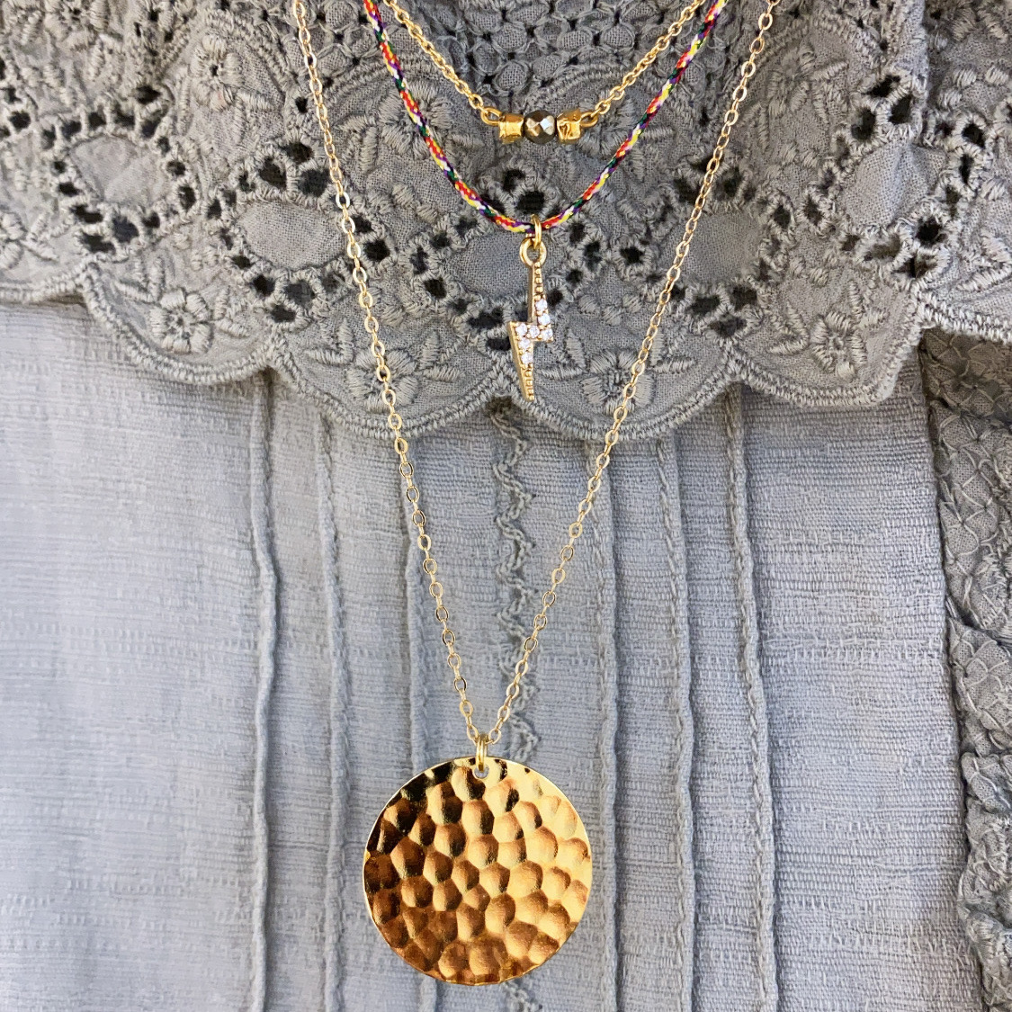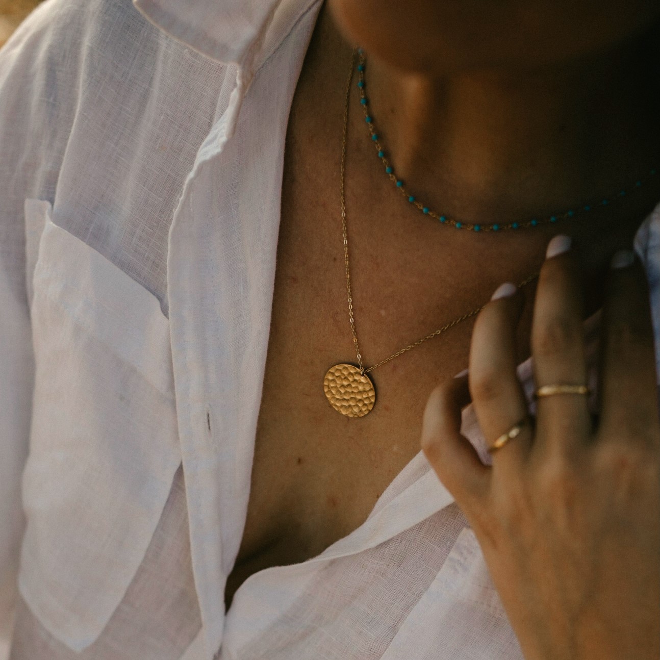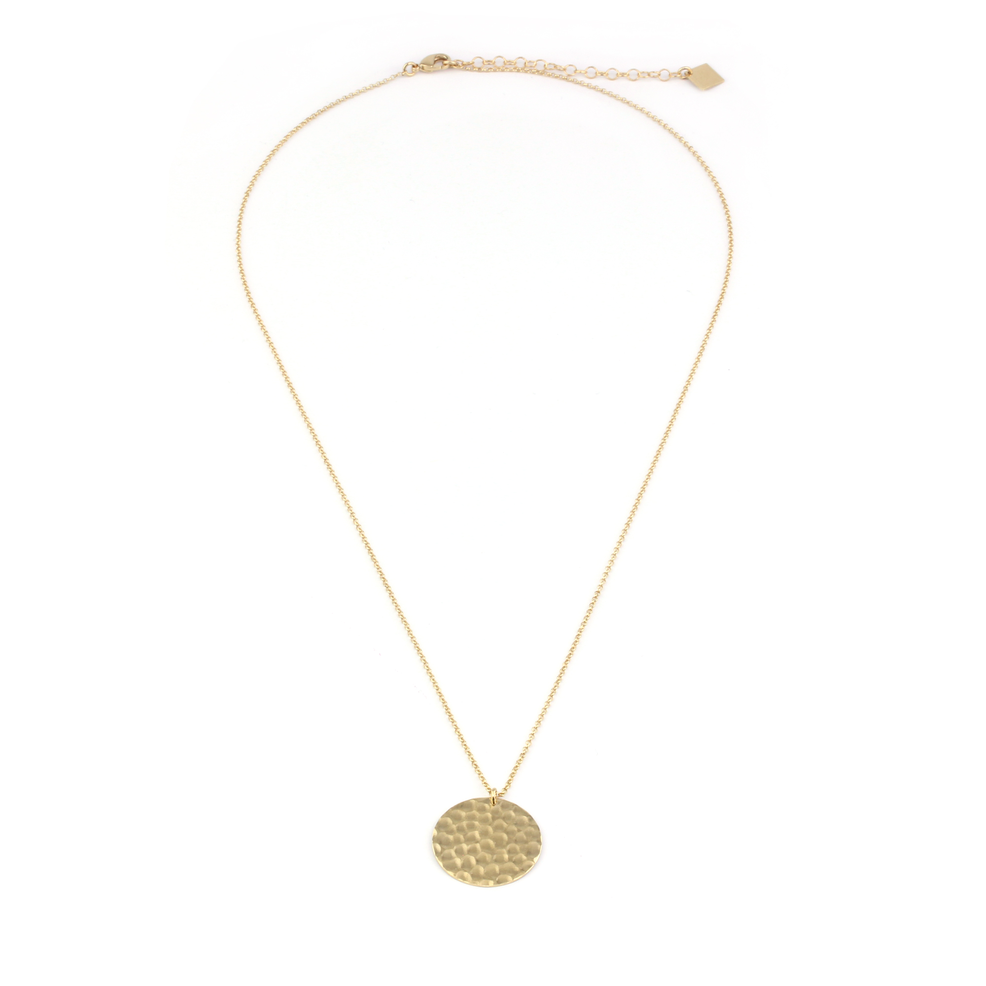 Ce bijou est personnalisableGrand collier Syracuse. Composé d'une chaîne dorée à l'or fin et d'une pastille martelée.