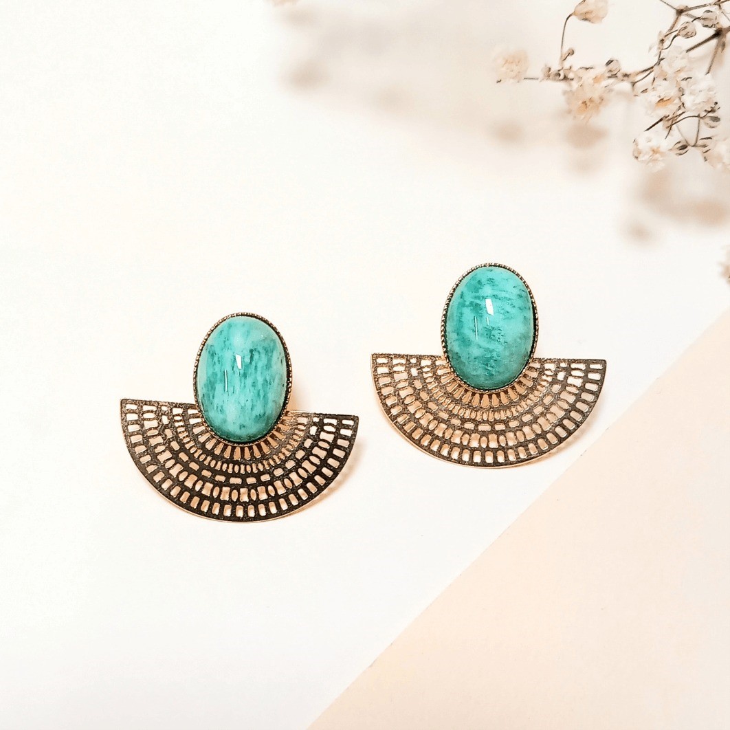 Boucles d’oreilles dorées à l’or fin 24K composées d’une pierre fine de forme ovale sous laquelle se trouve un motif de style Aztèque en forme d’éventail.