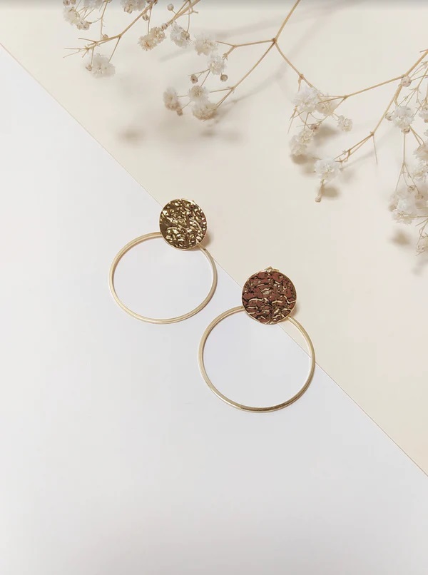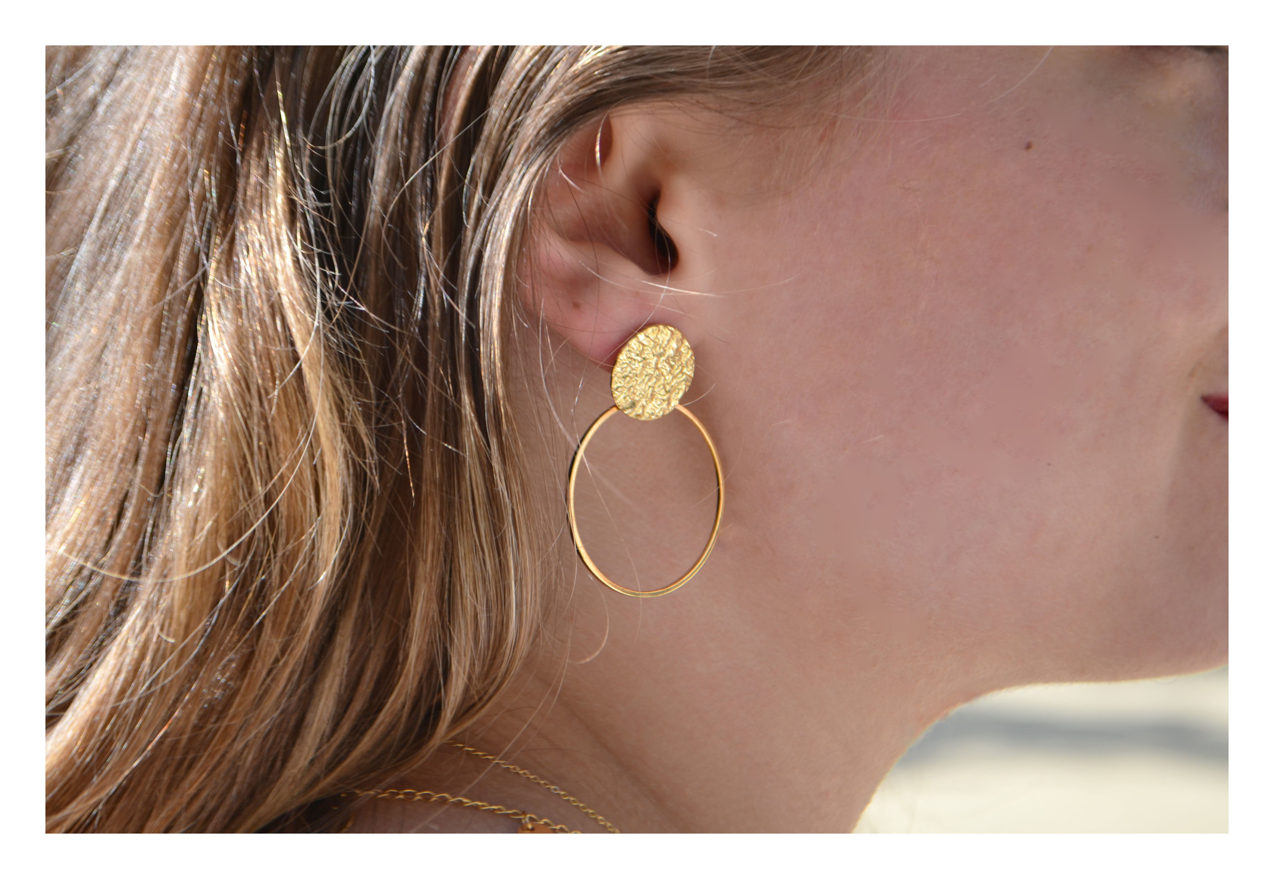 Boucles d’oreilles composées d'un petit disque texturé auquel est relié un anneau martelé et mobile.
