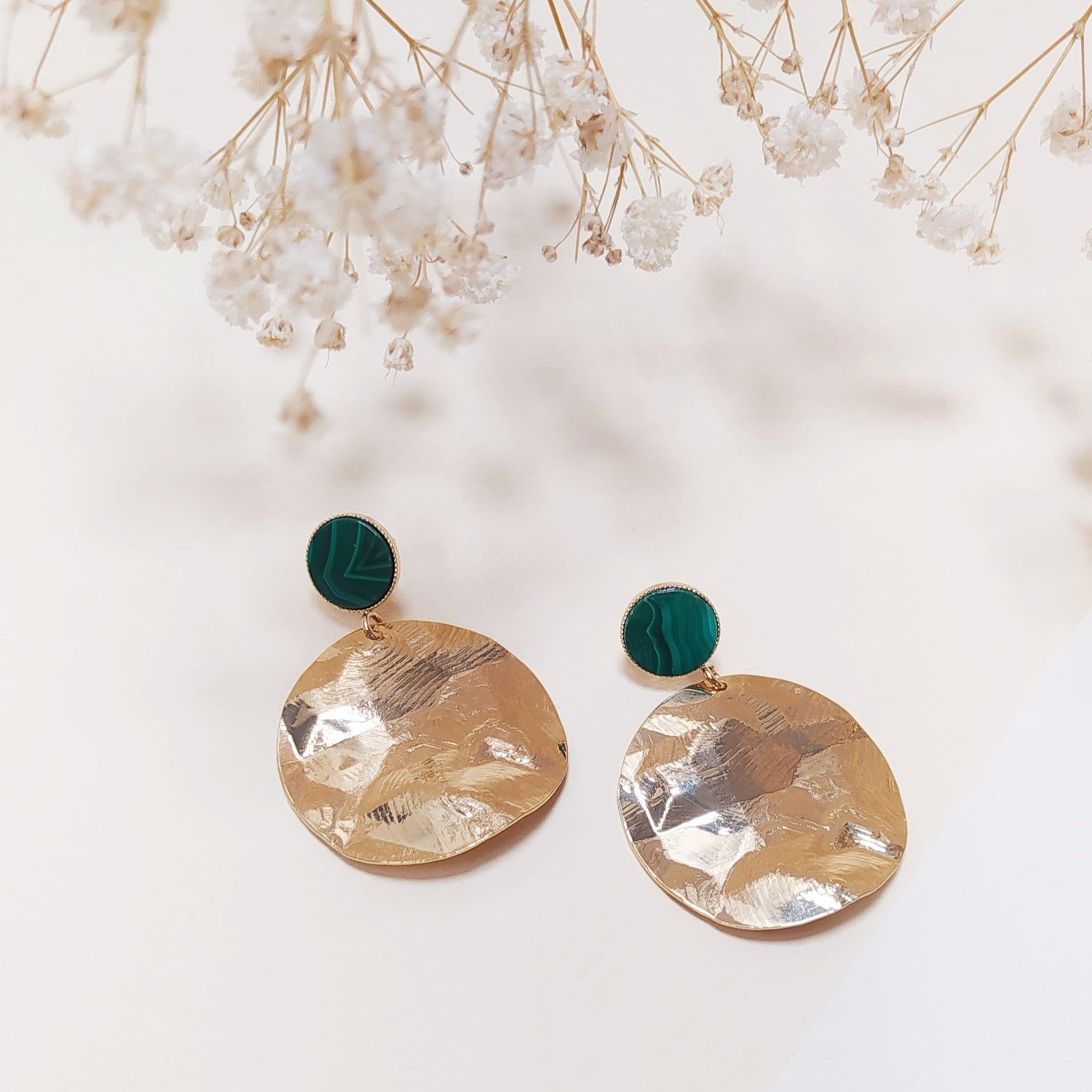 Boucles d’oreilles dorées à l’or fin 24K composées d’une pastille ornée d’une pierre fine à laquelle est rattachée une plaque de forme ronde et martelée.
