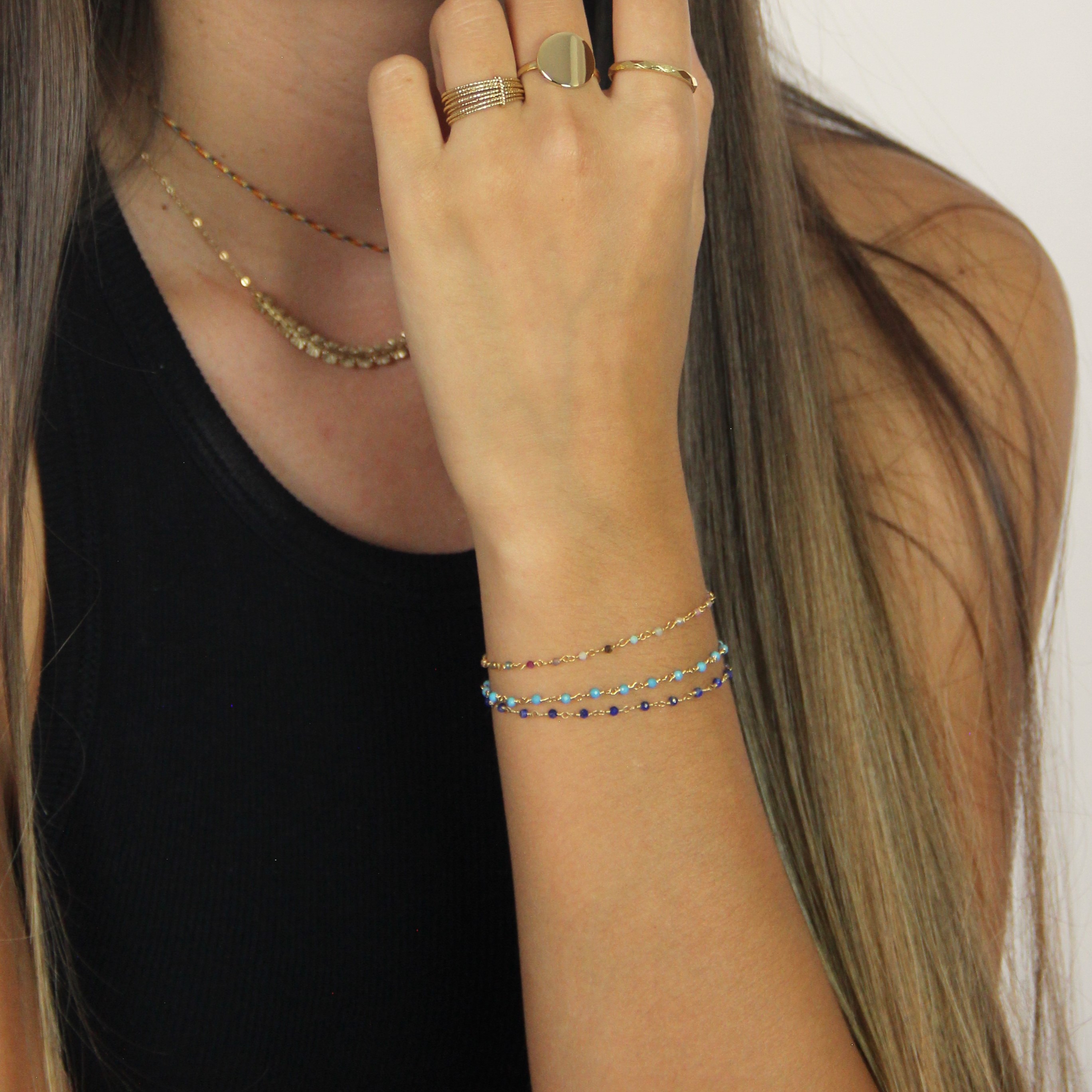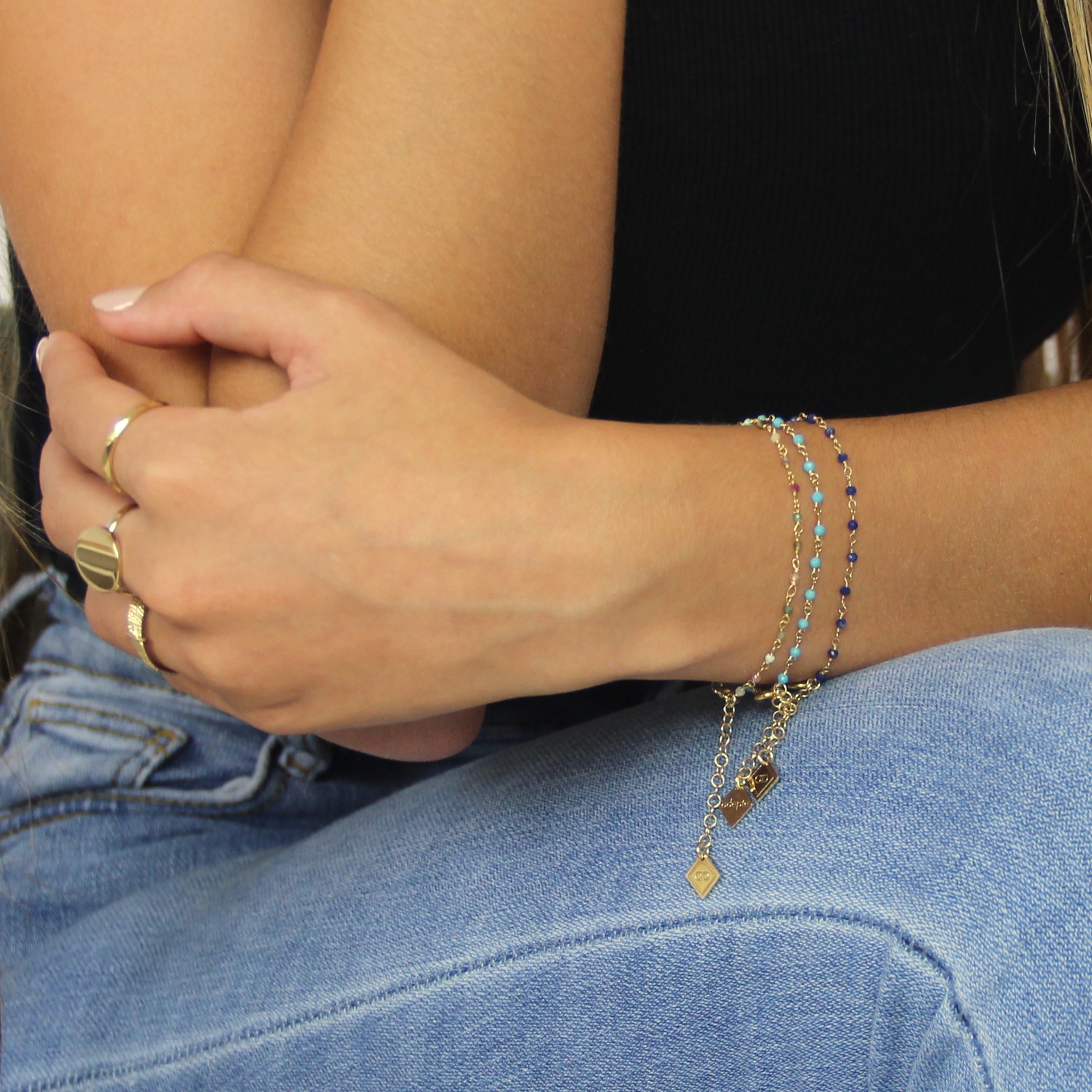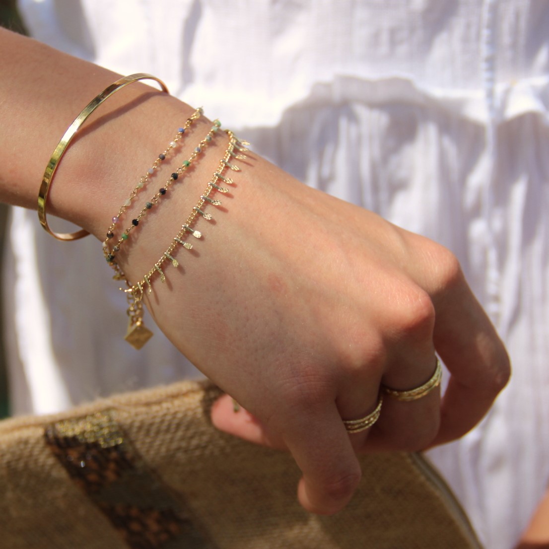 La chaine, fabriquée artisanalement est composée d’un fil doré à l’or fin et de pierres fines. Le bracelet est ajustable.