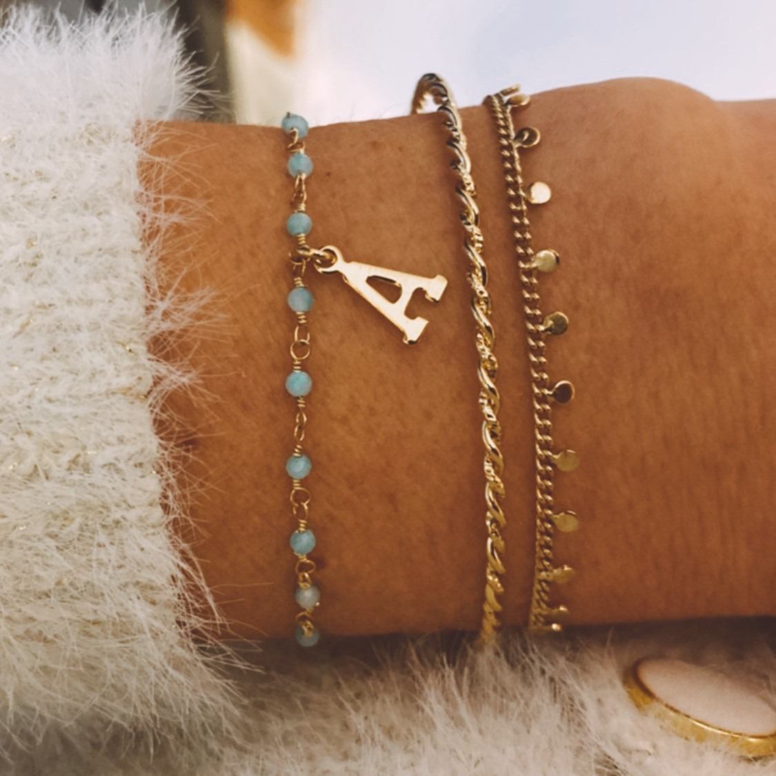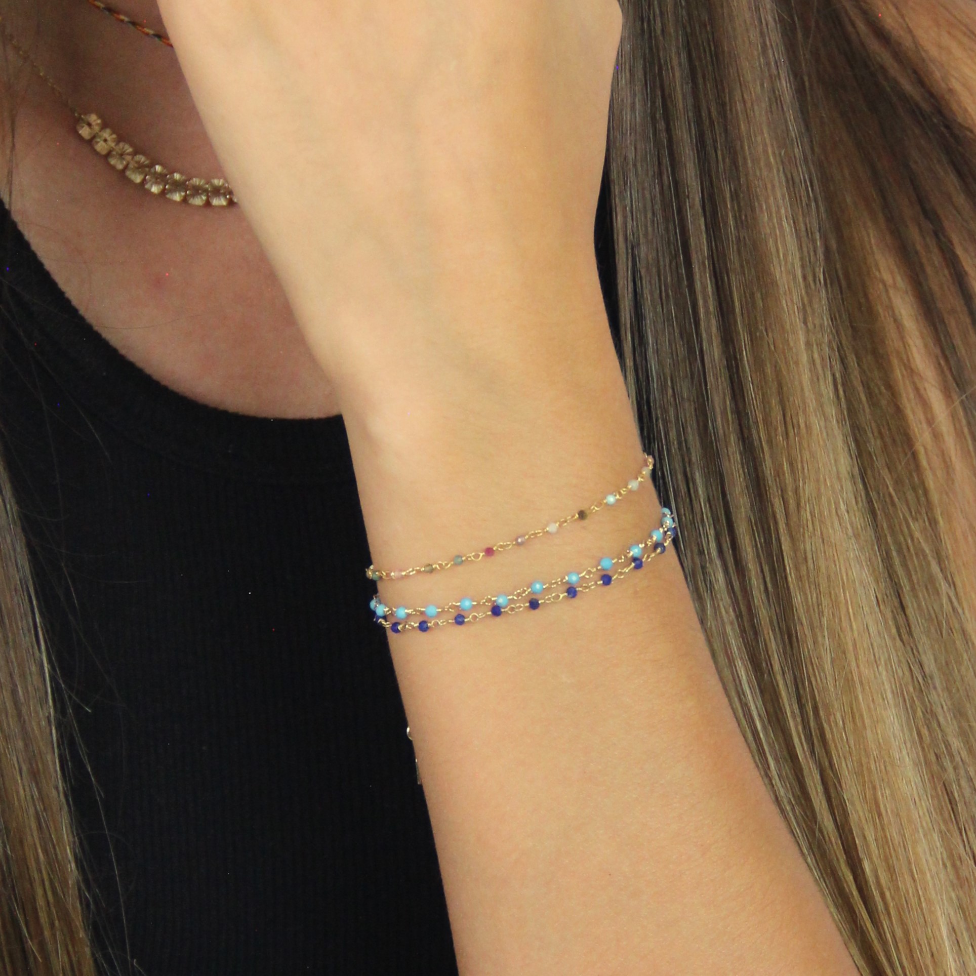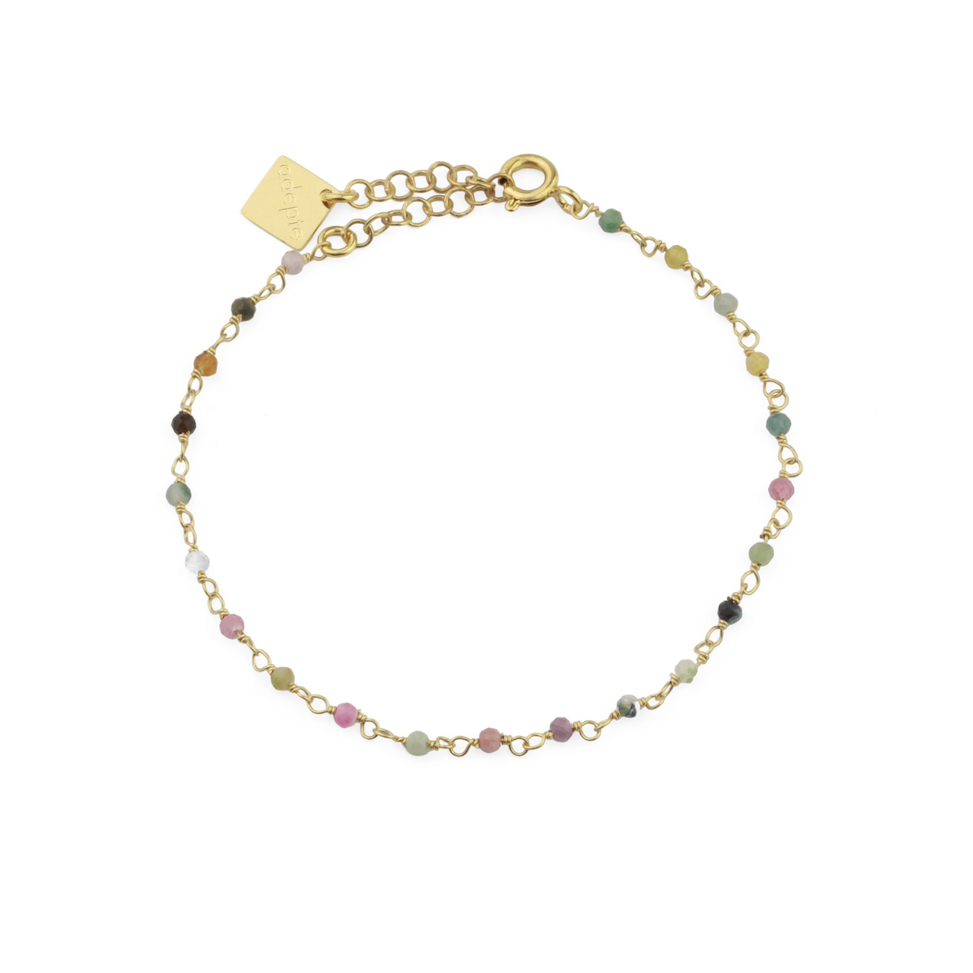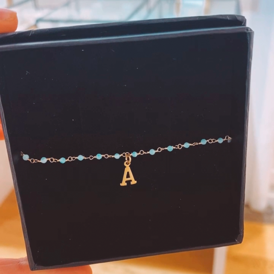 La chaine, fabriquée artisanalement est composée d’un fil doré à l’or fin et de pierres fines. Le bracelet est ajustable.