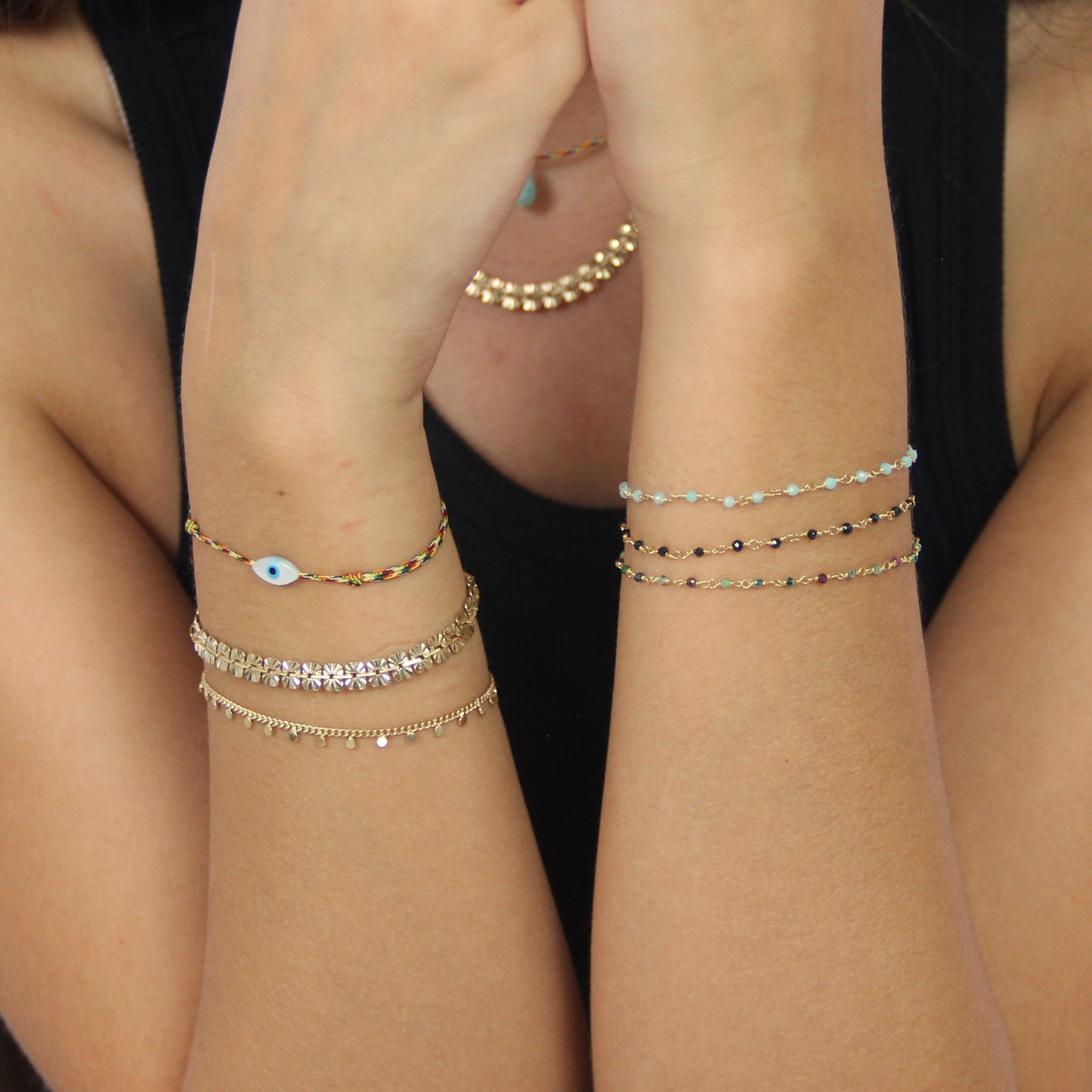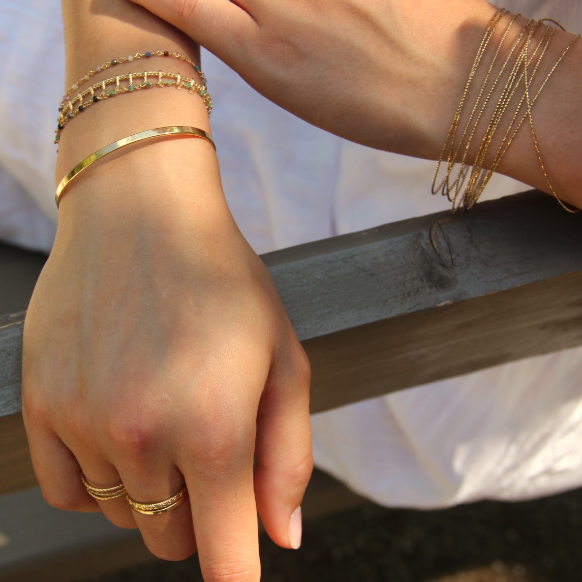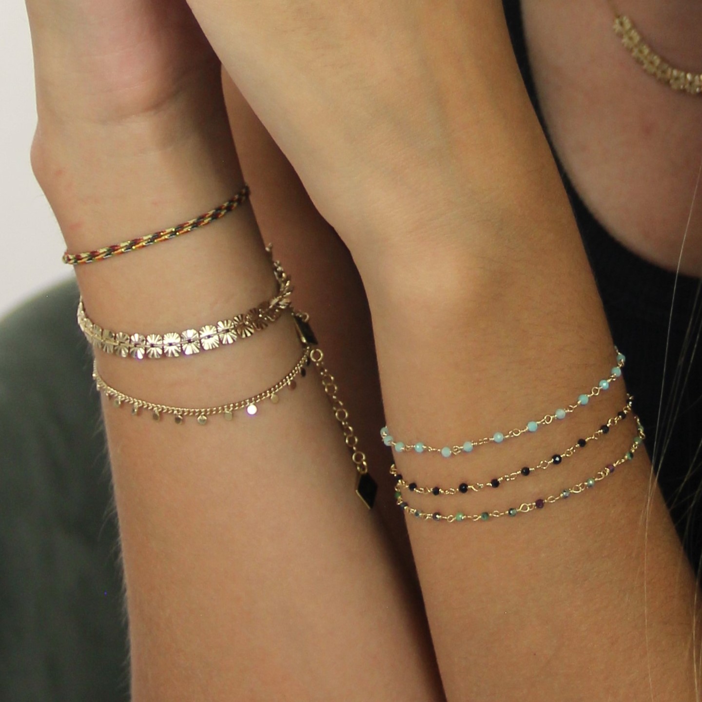 La chaine, fabriquée artisanalement est composée d’un fil doré à l’or fin et de pierres fines. Le bracelet est ajustable.