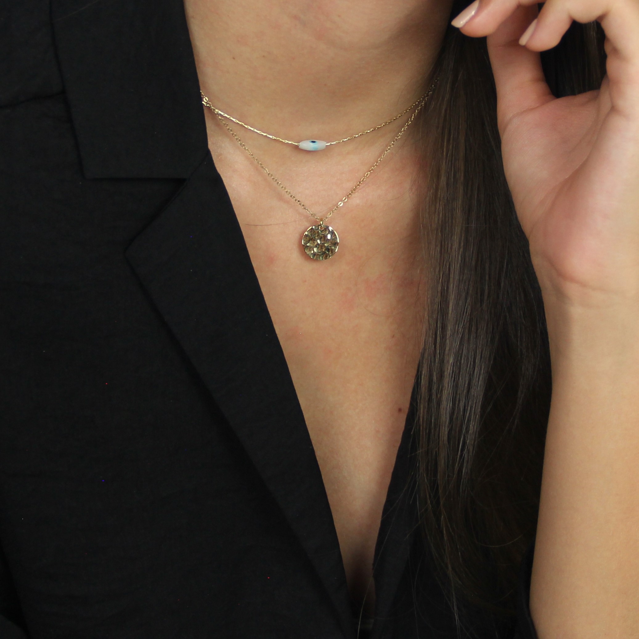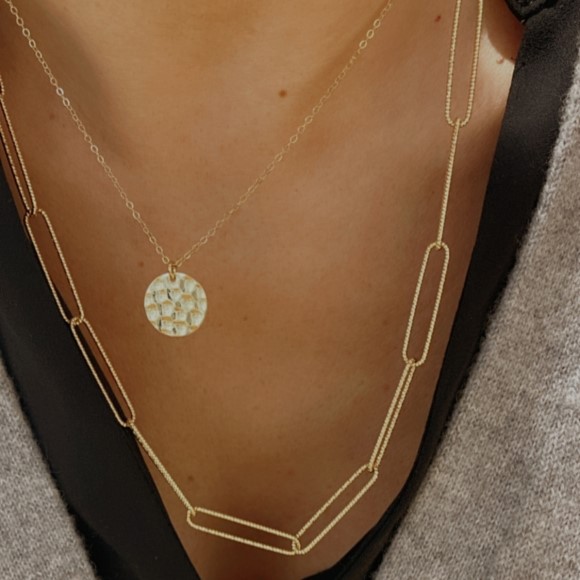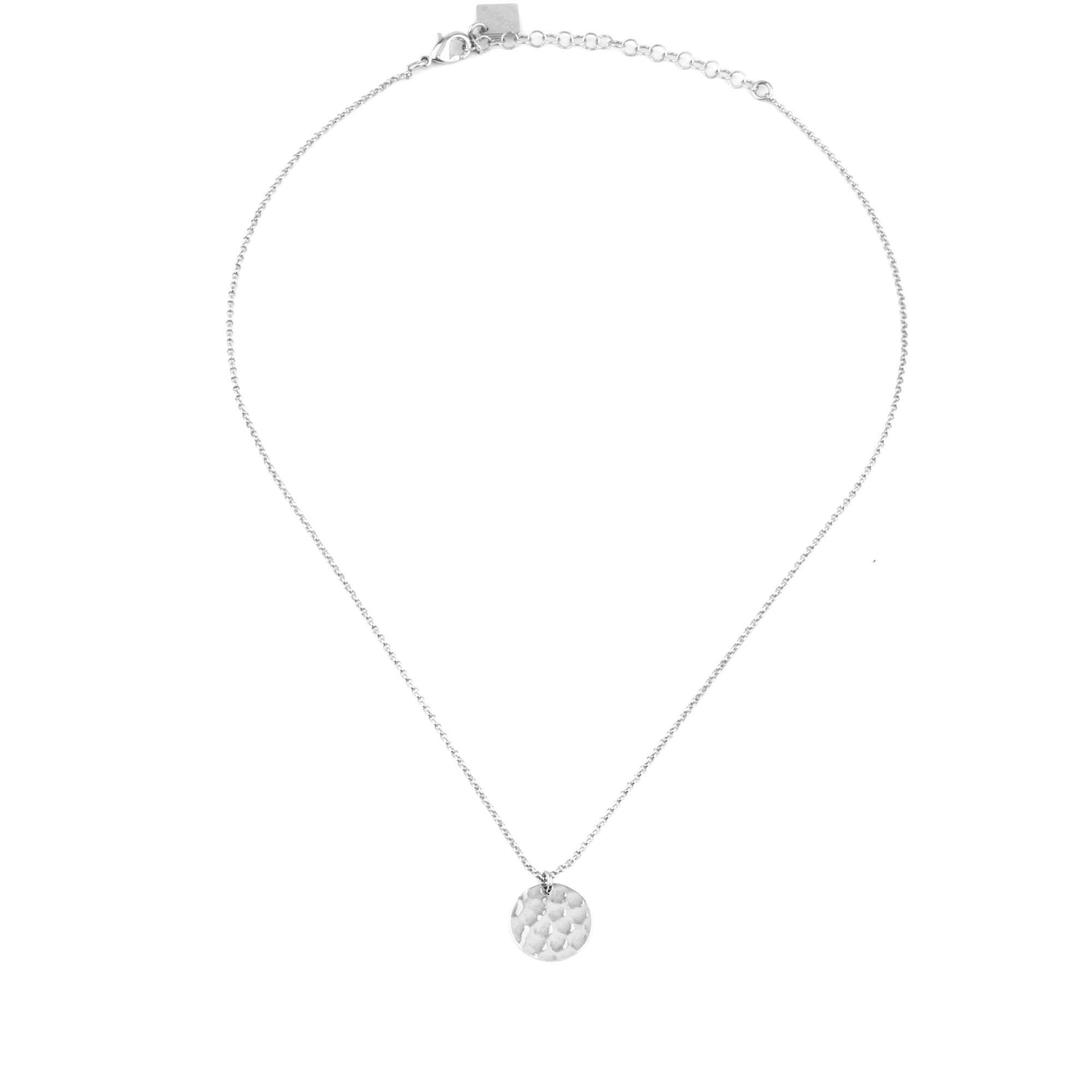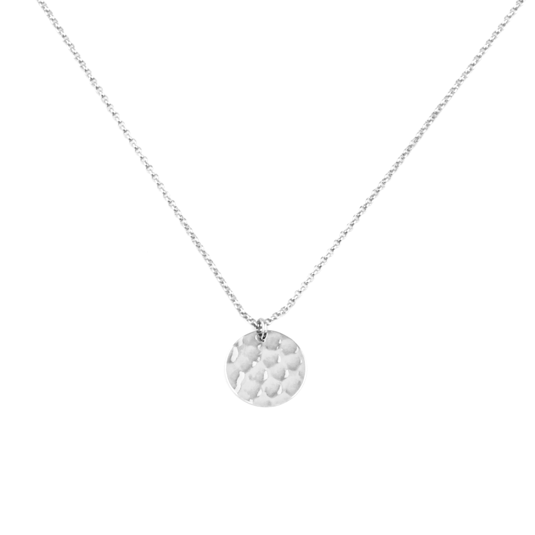 Petit collier Syracuse. Composé d'une chaîne plaquée argent et d'une pastille martelée.