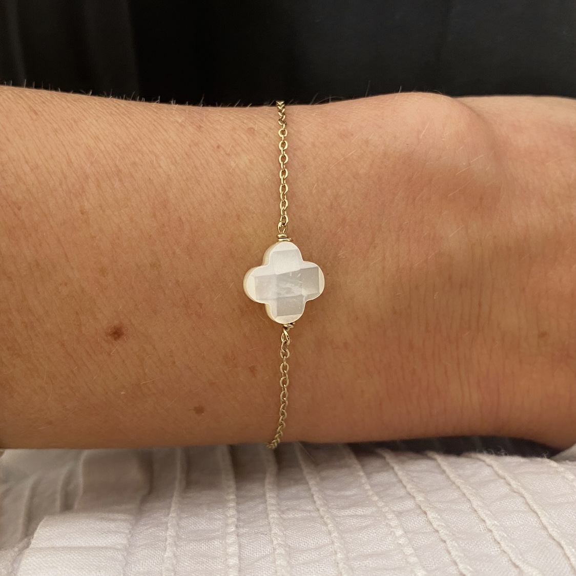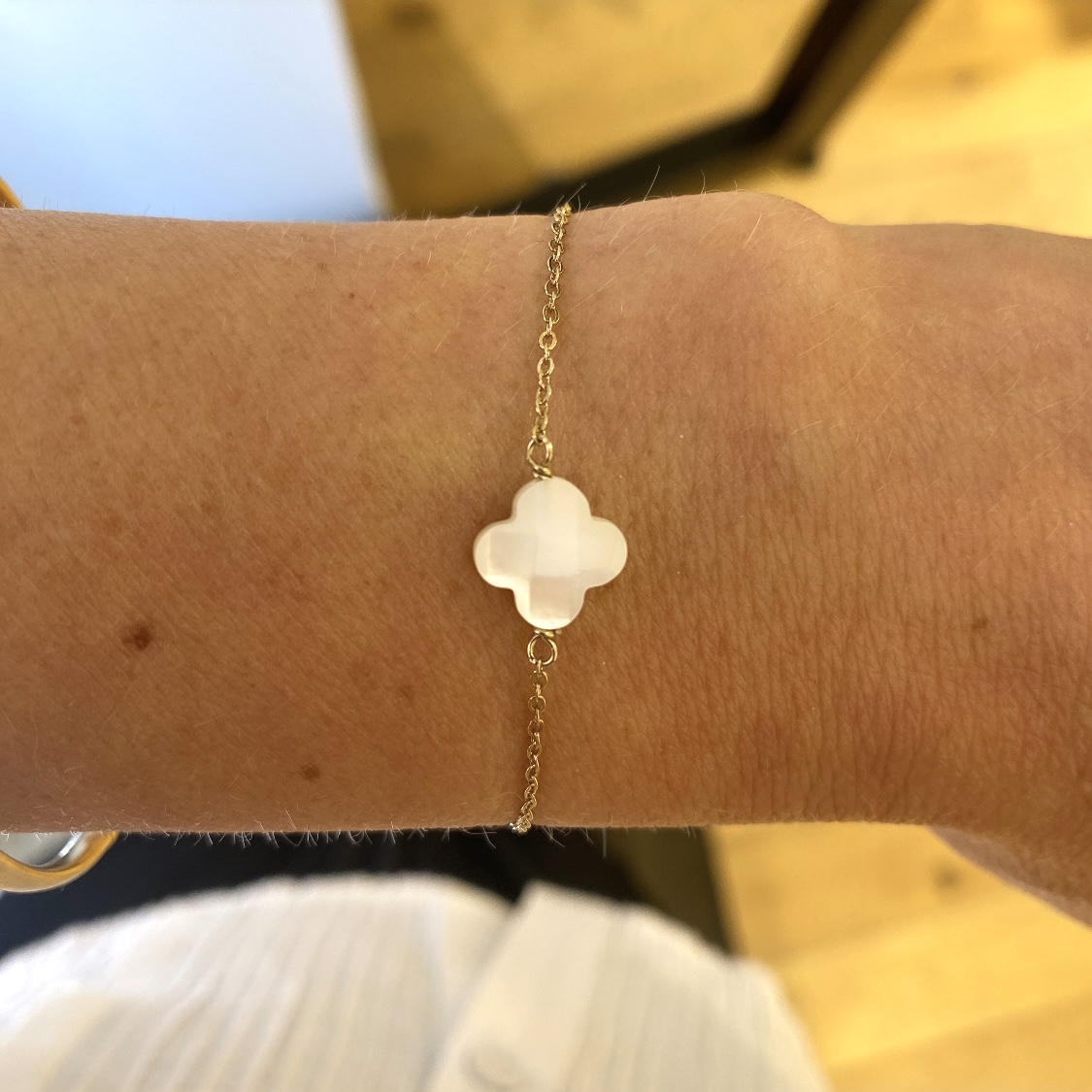 Le bracelet Clover se compose d'une chaîne avec des maillons rectangles, et d'un pendentif nacré en forme de trèfle.