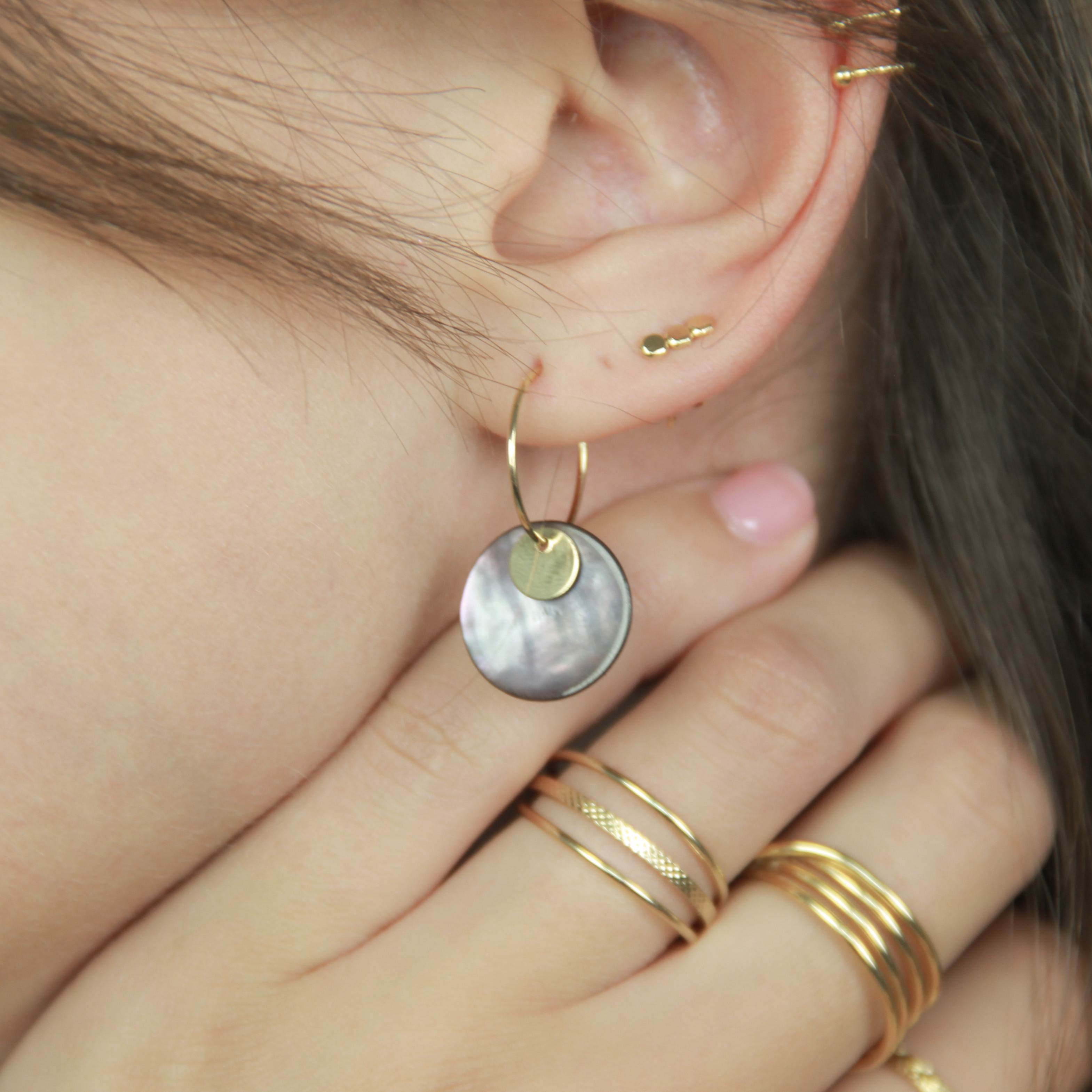 Les boucles d'oreilles Shell sont des créoles composées d'une pastille en nacre teintée et d'une petite pastille dorée.