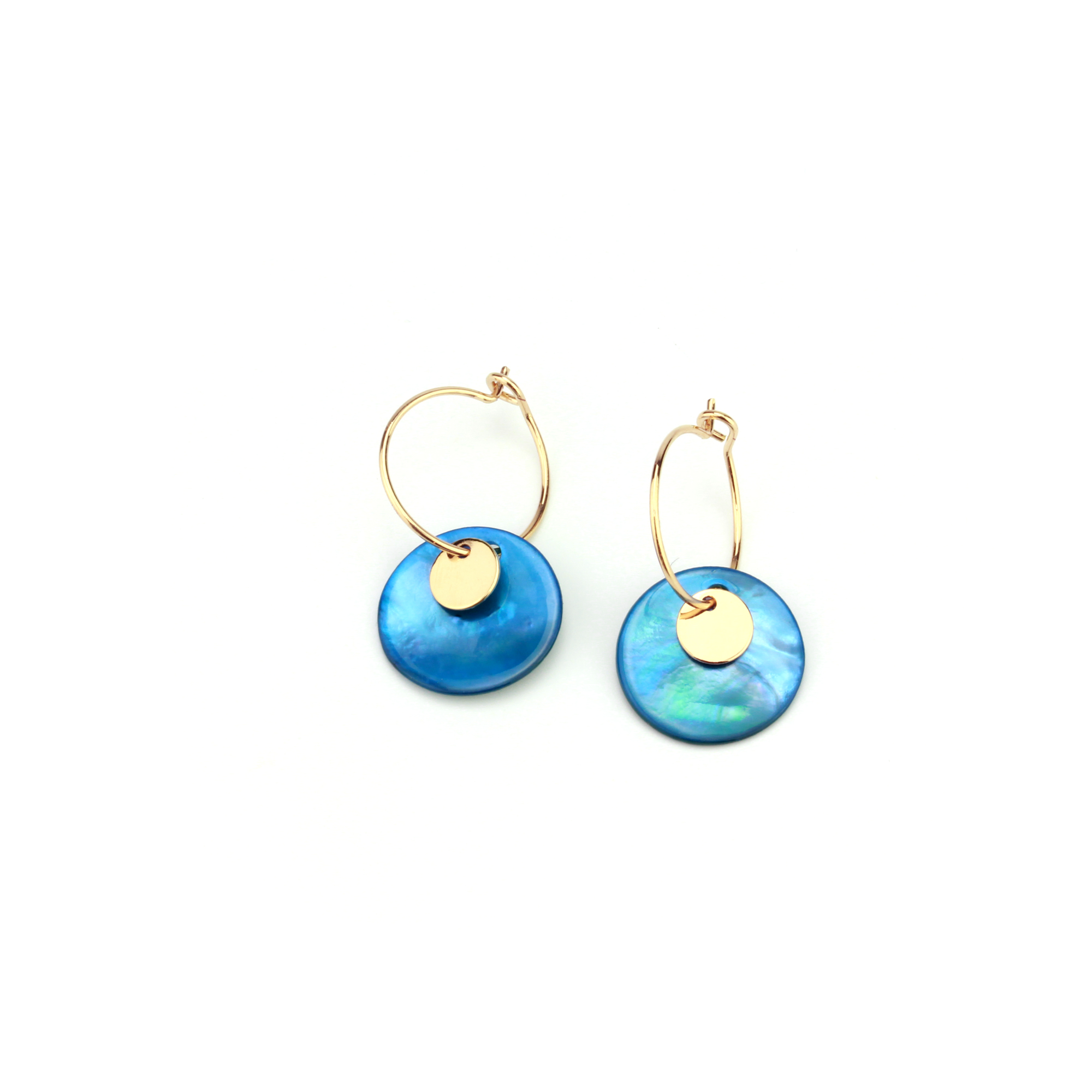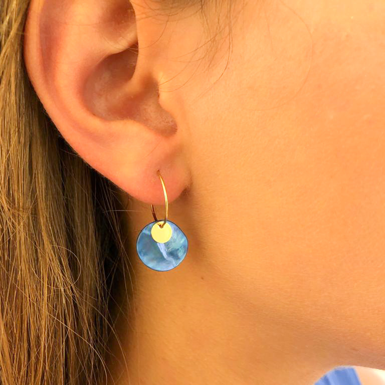 Les boucles d'oreilles Shell sont des créoles composées d'une pastille en nacre teintée et d'une petite pastille dorée.