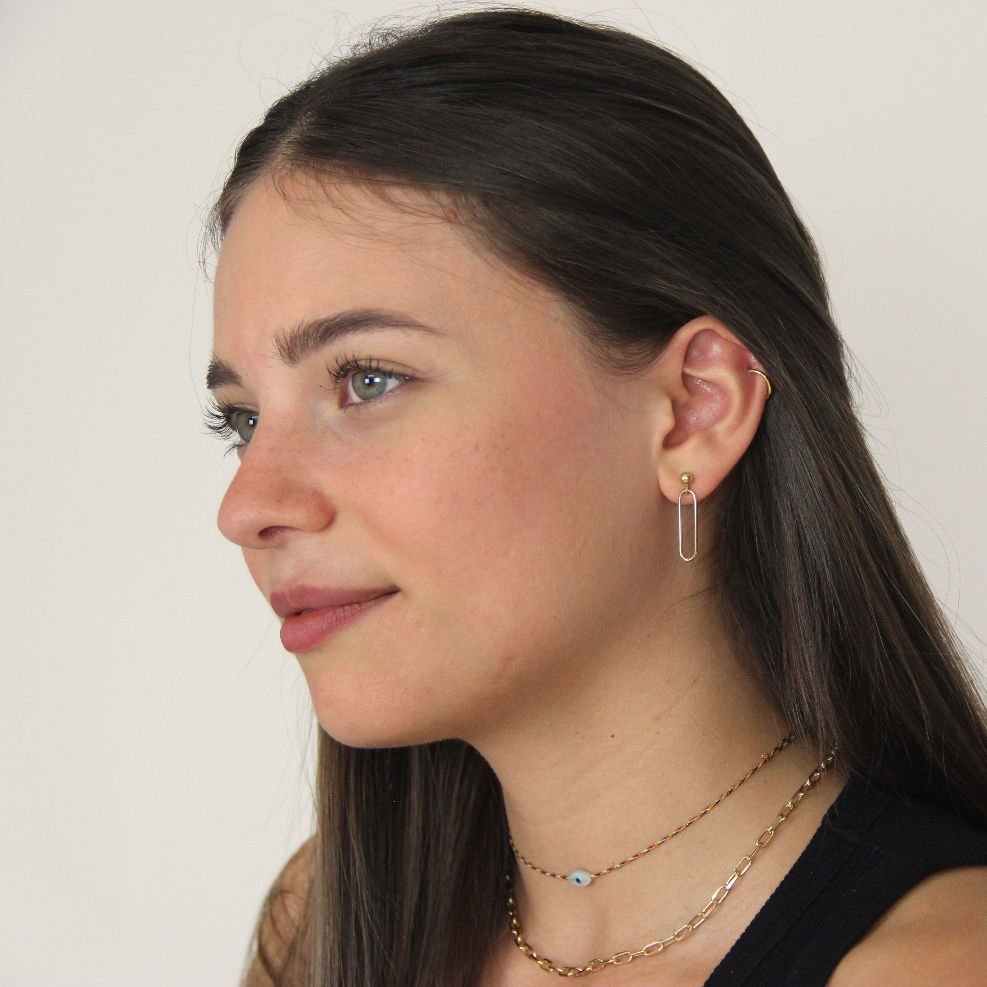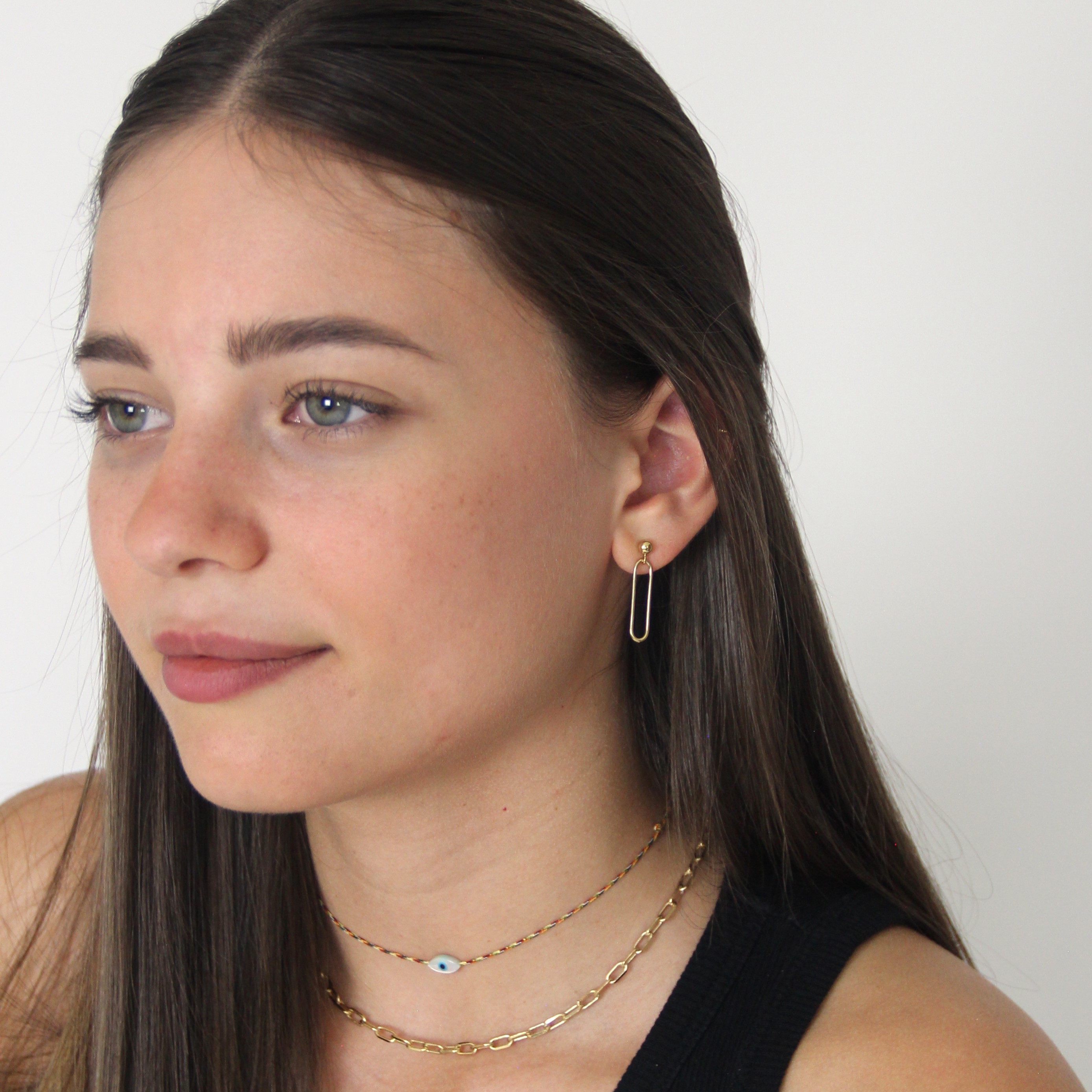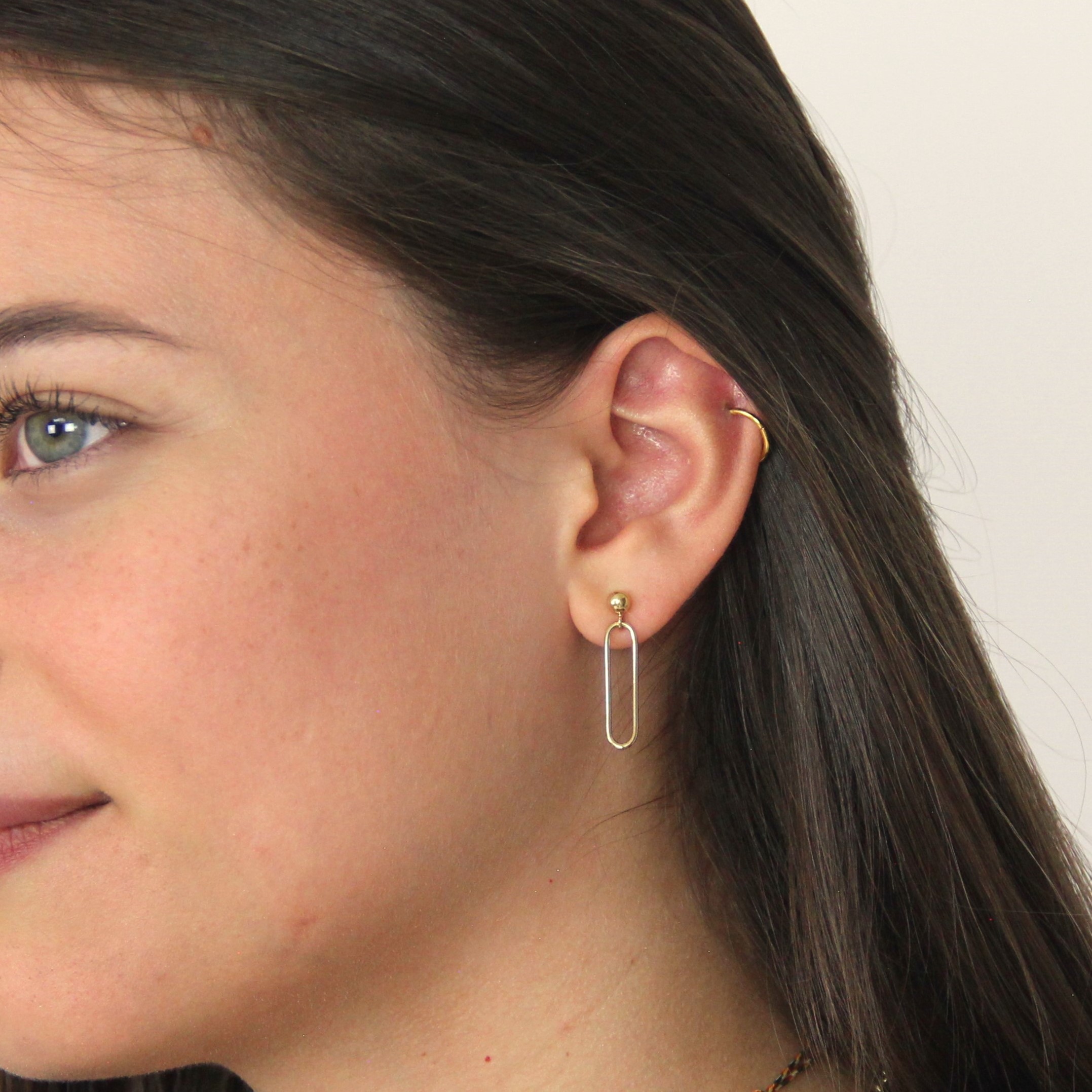 Les boucles d'oreilles Lou sont composées d'une petite perle dorée et d'un maillon rectangle.