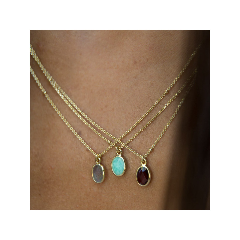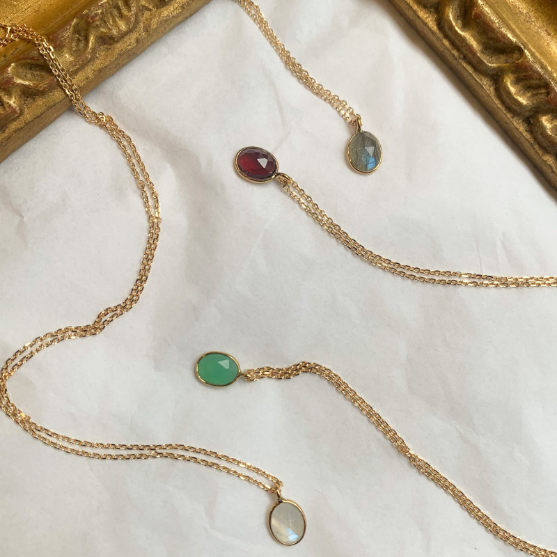 Il s'agit d'un collier de 42 cm avec en pendentif une pierre fine sertie.