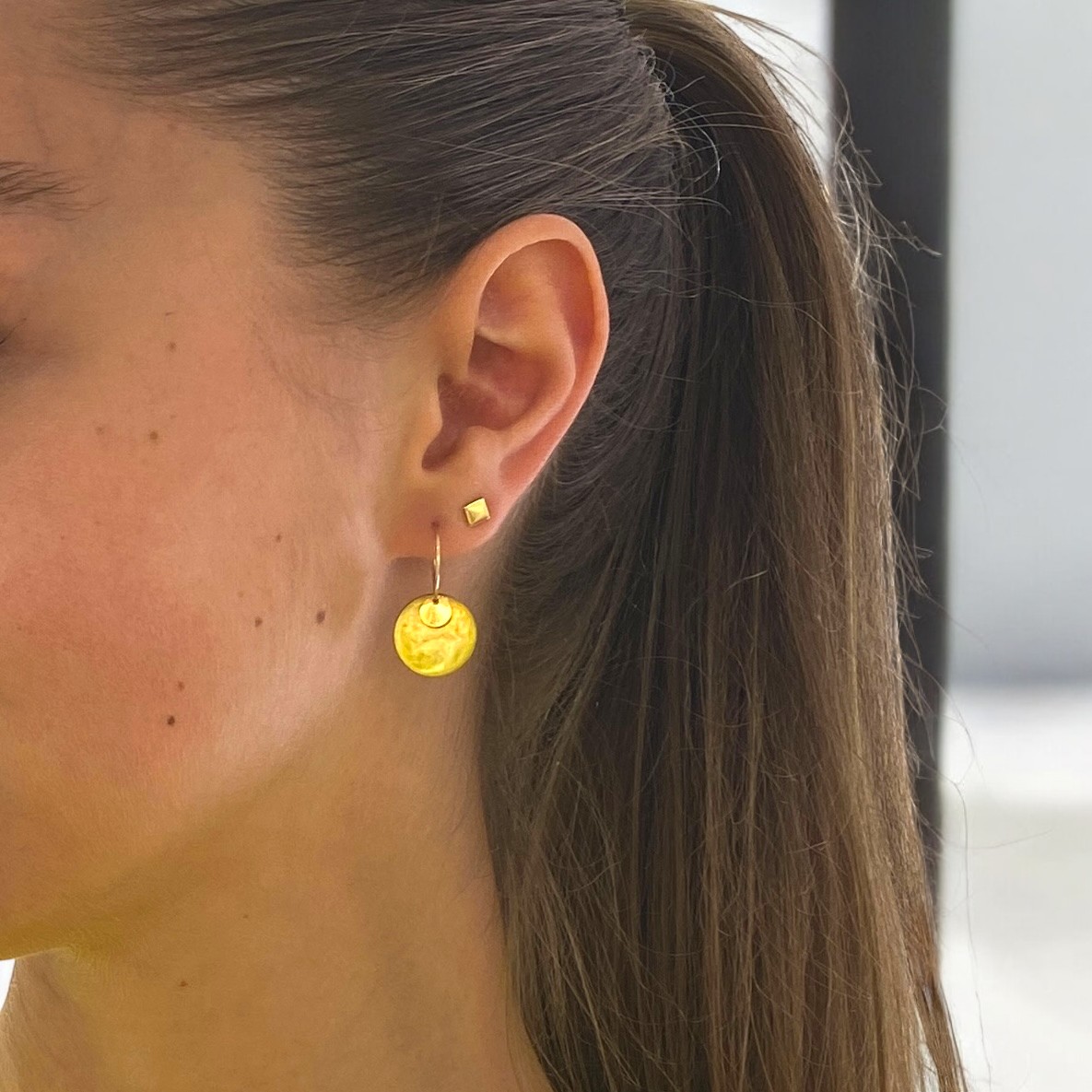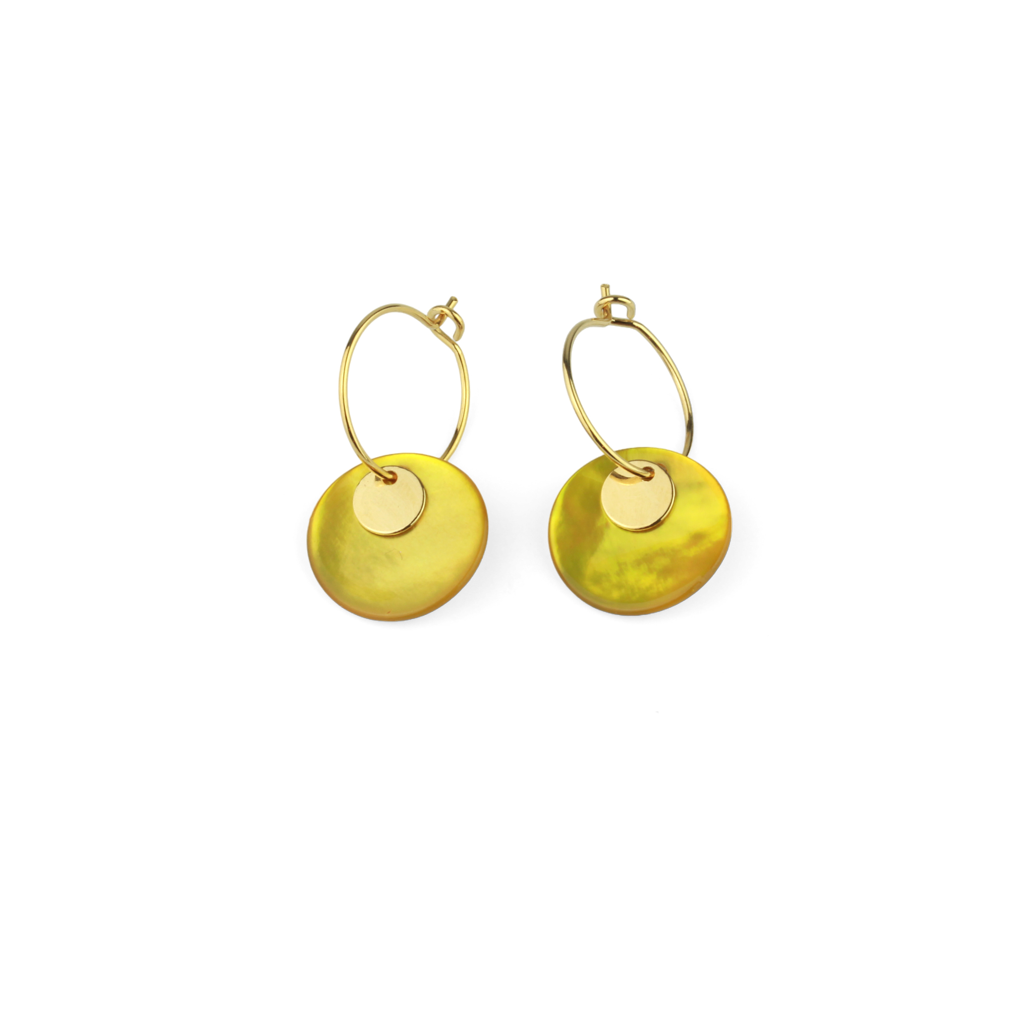 Les boucles d'oreilles Shell sont des créoles composées d'une pastille en nacre teintée et d'une petite pastille dorée.