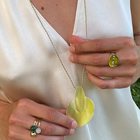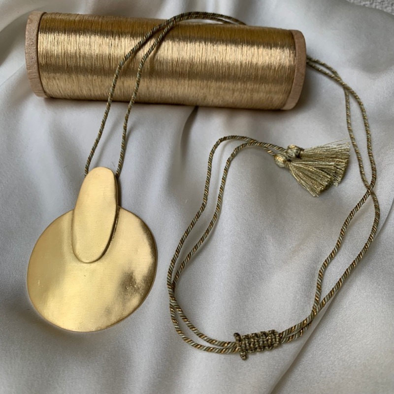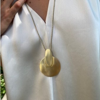 Sautoir fil kaki dorée noeud coulissant grande médaille en laiton brossé plaquée or 3 microns