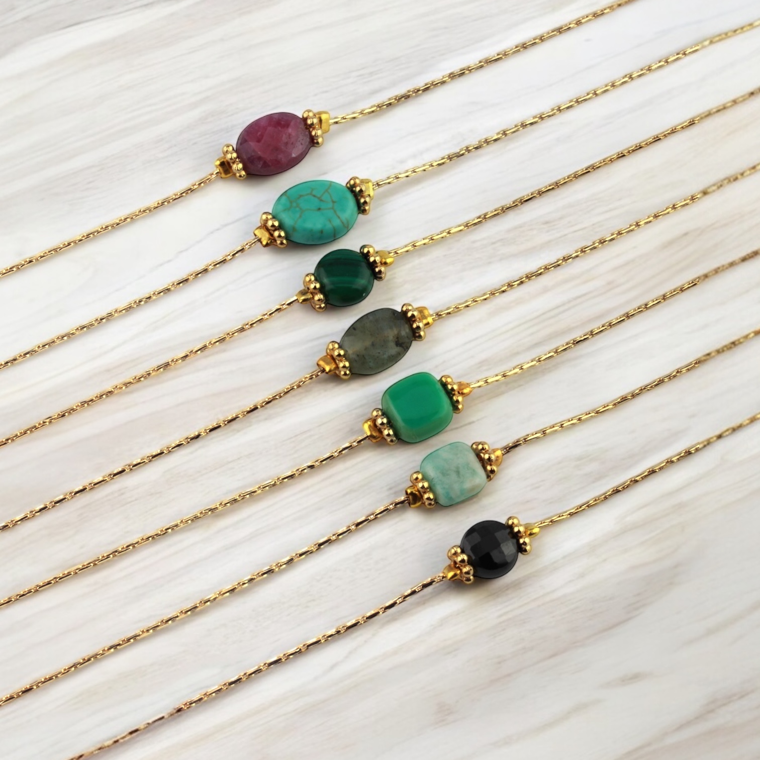 Élégance et raffinement. Le bracelet stone est composé d'une chaîne très fine, d'une pierre ovale encadrée par 2 rondelles dorées à l'or fin.