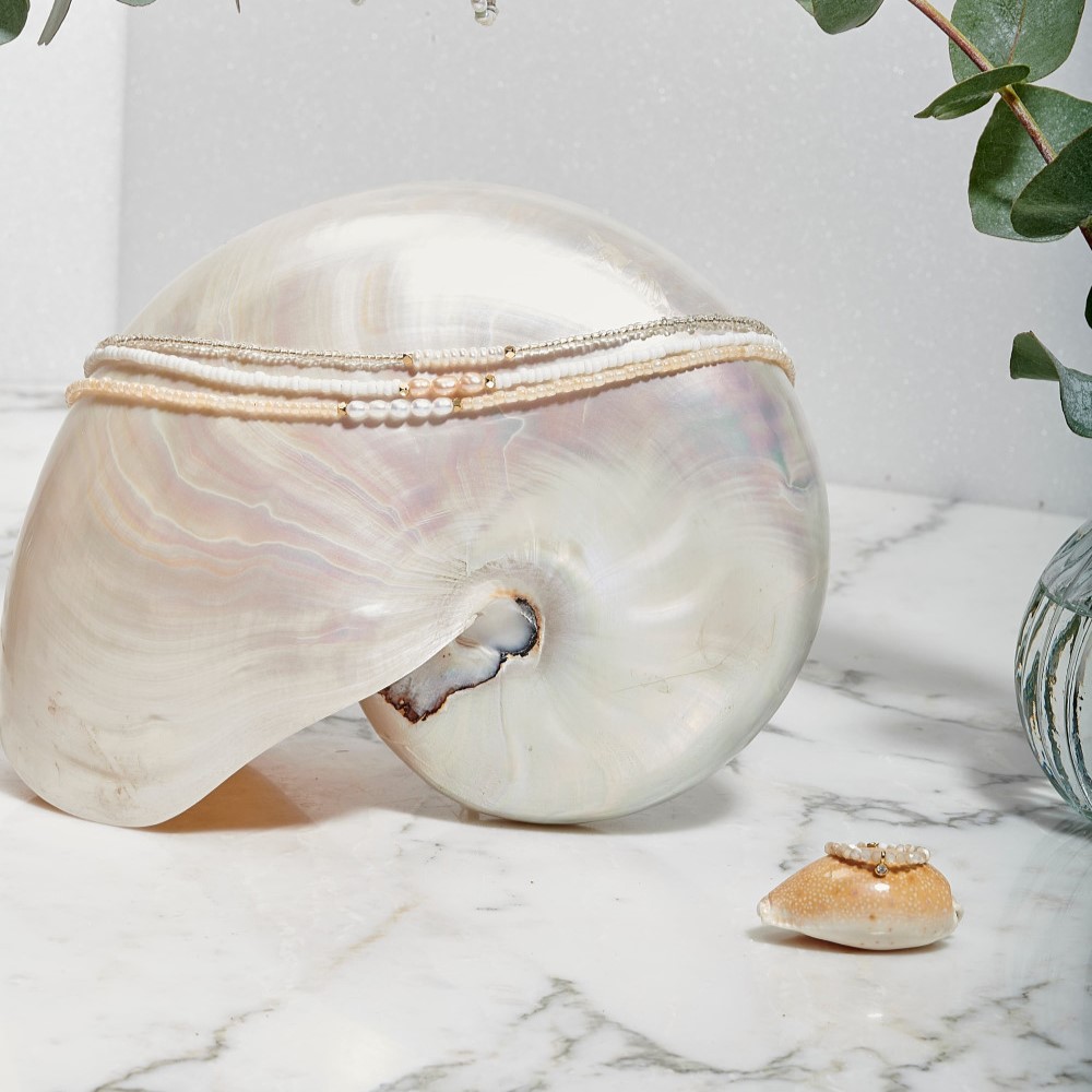 Le collier René se compose d’un enfilage de perles en verre et de 10 petites perles de culture sur un câble.