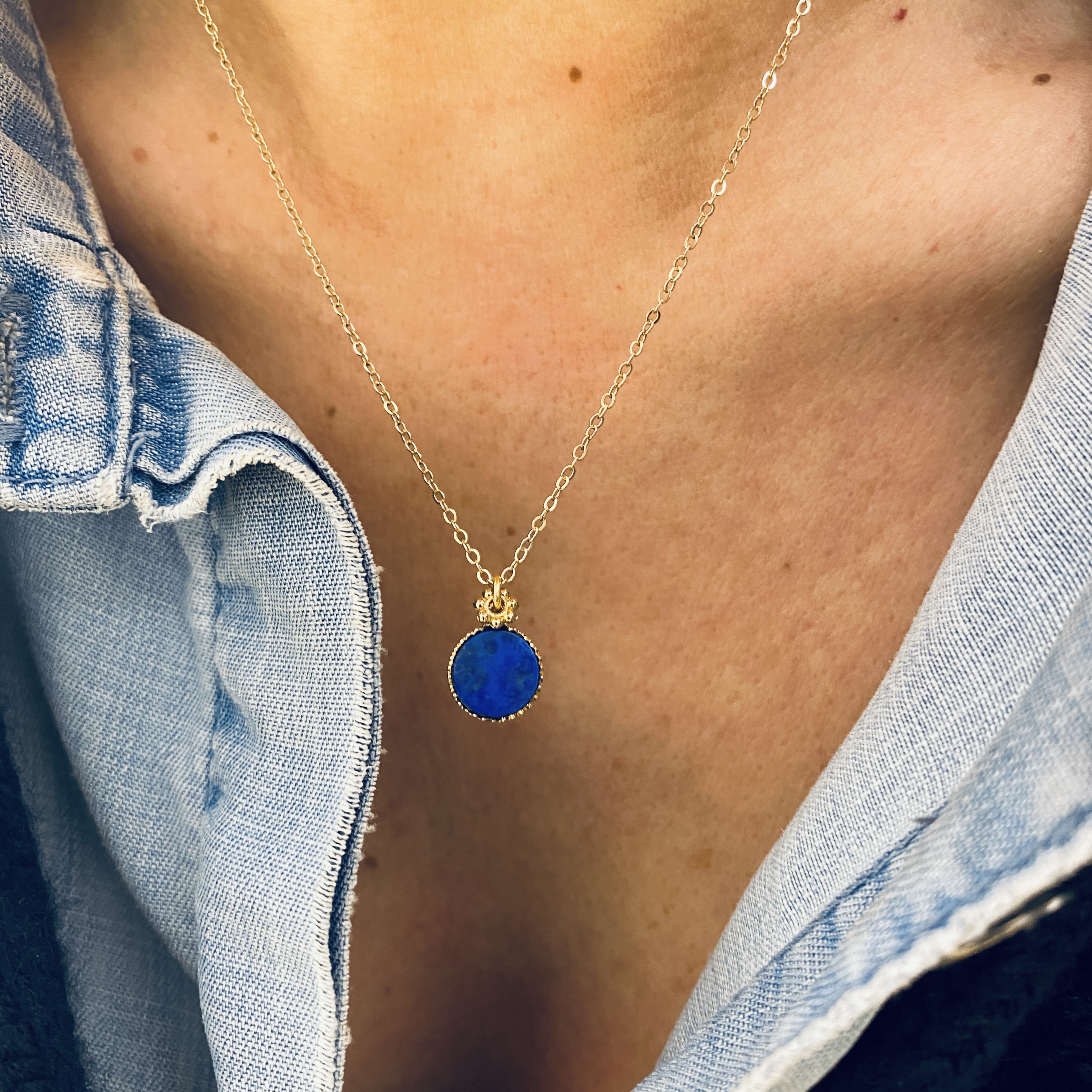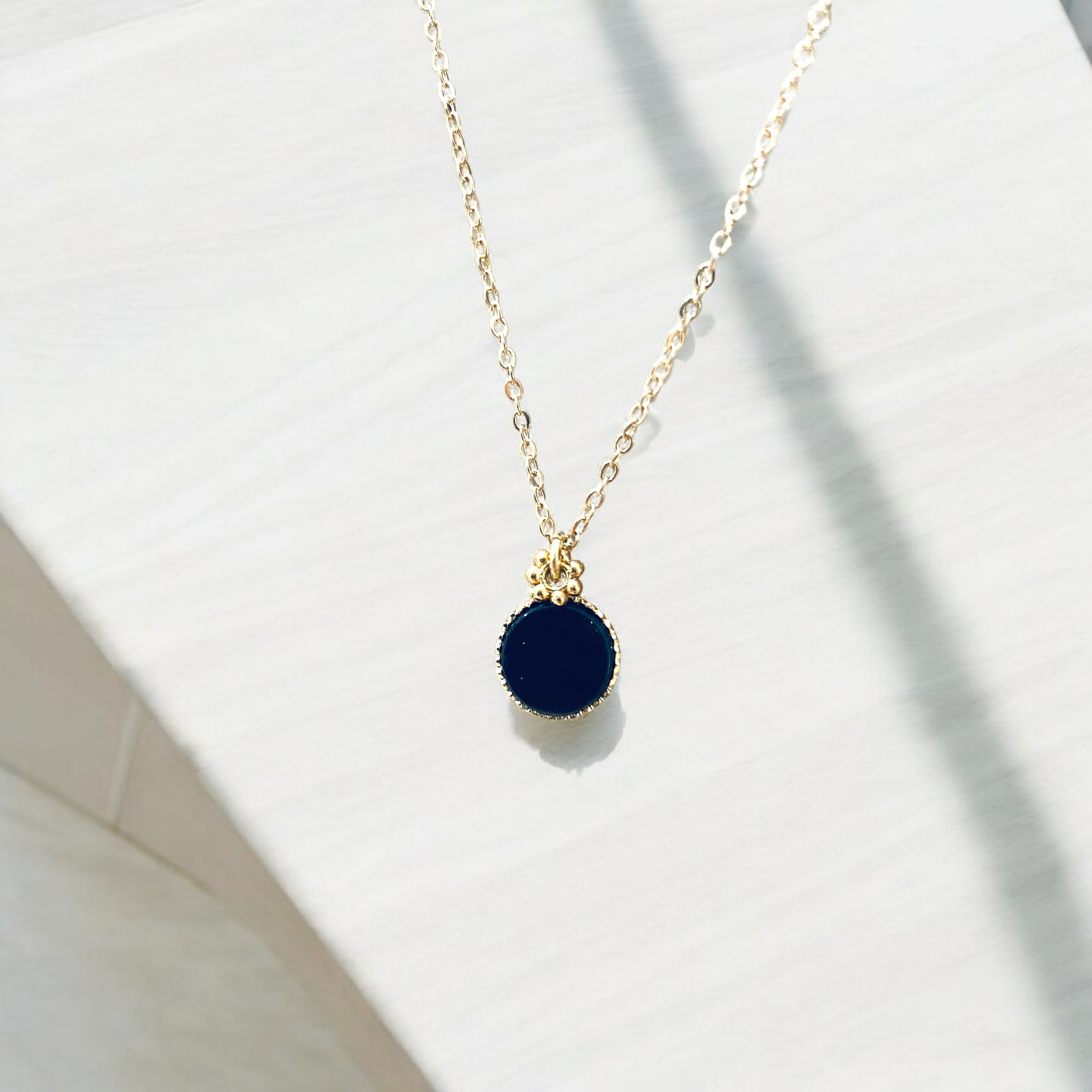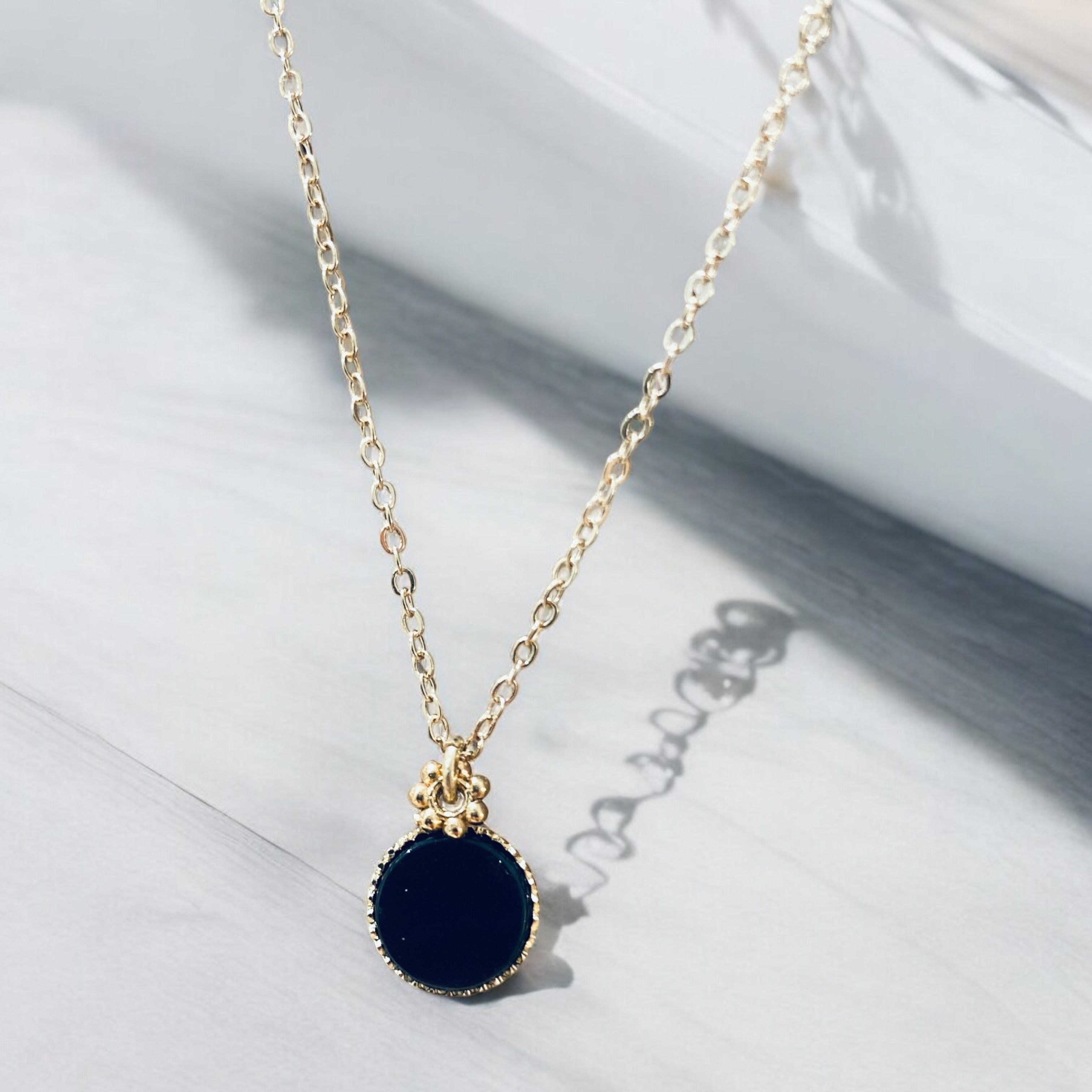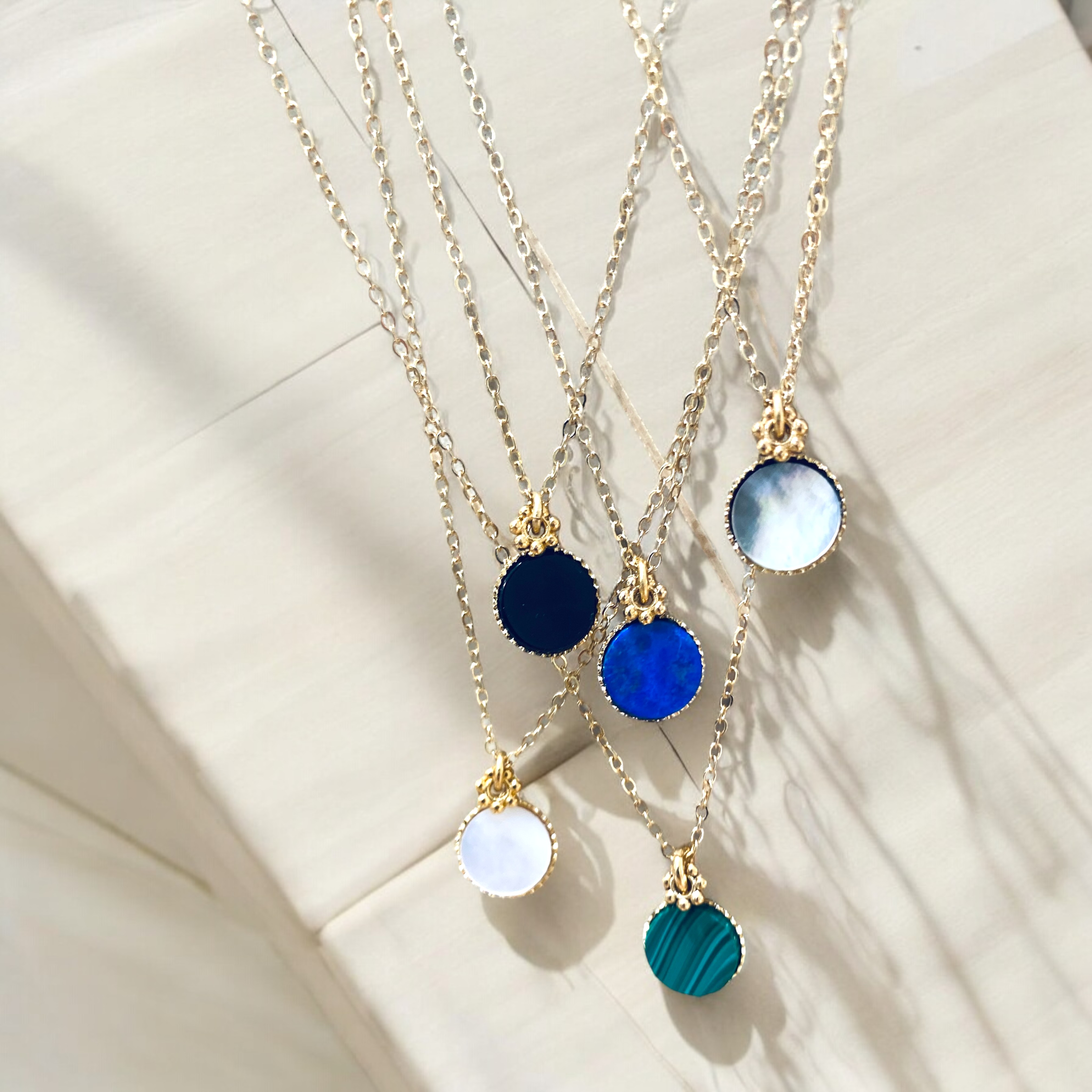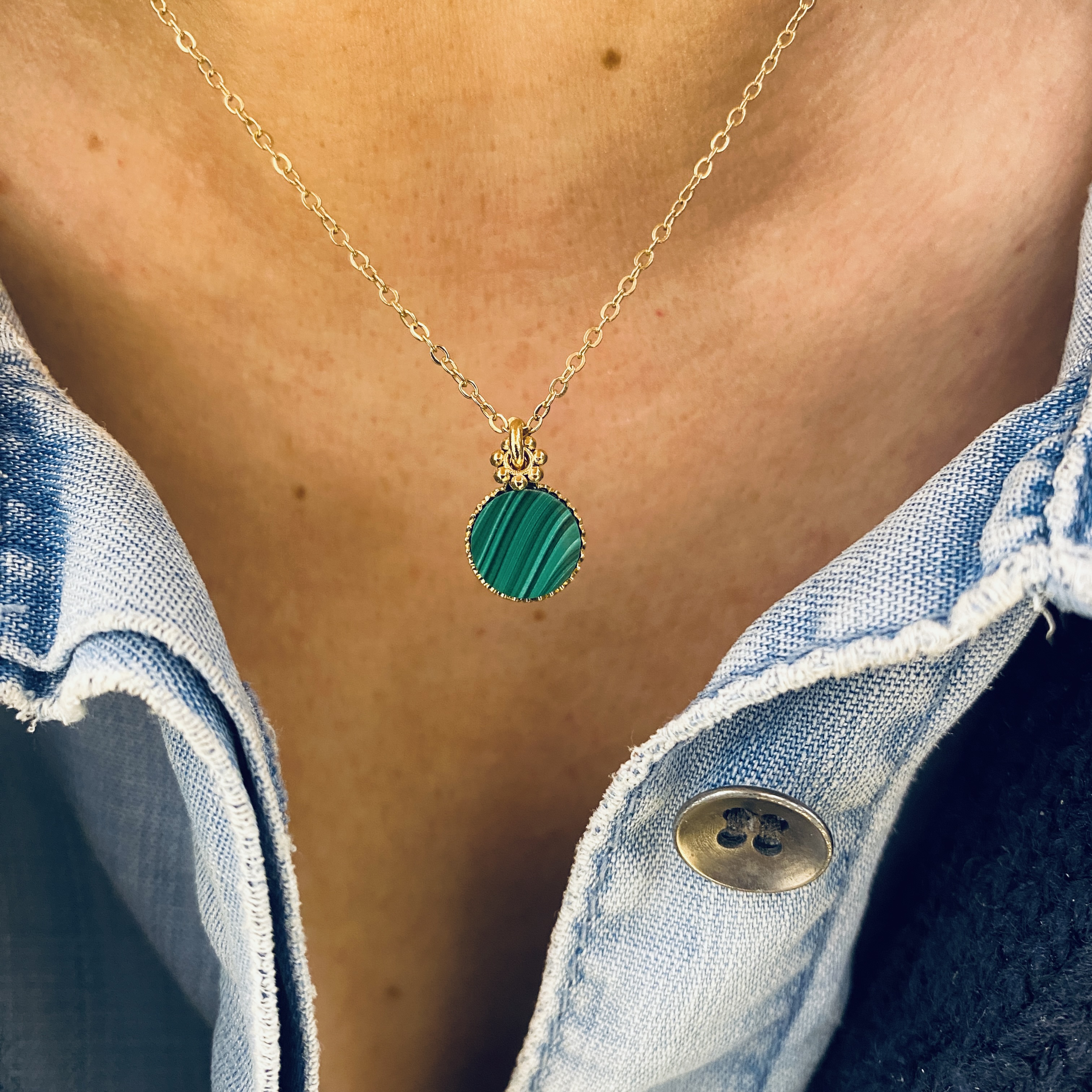 Le collier Anita est composé d'une chaîne dorée à l'or fin, d'un pendentif avec une pierre fine ronde et d'une mini intercalaire en forme de fleur.