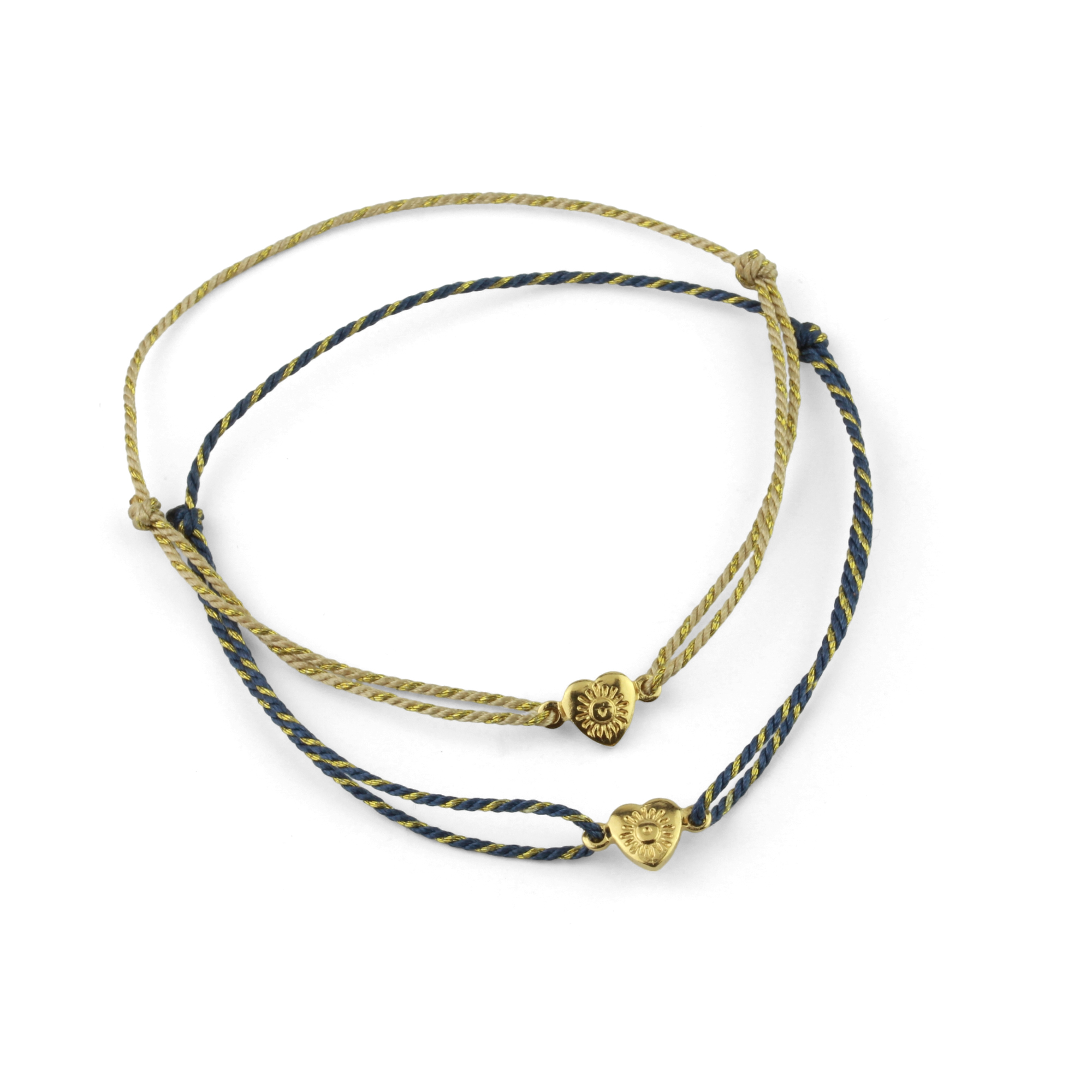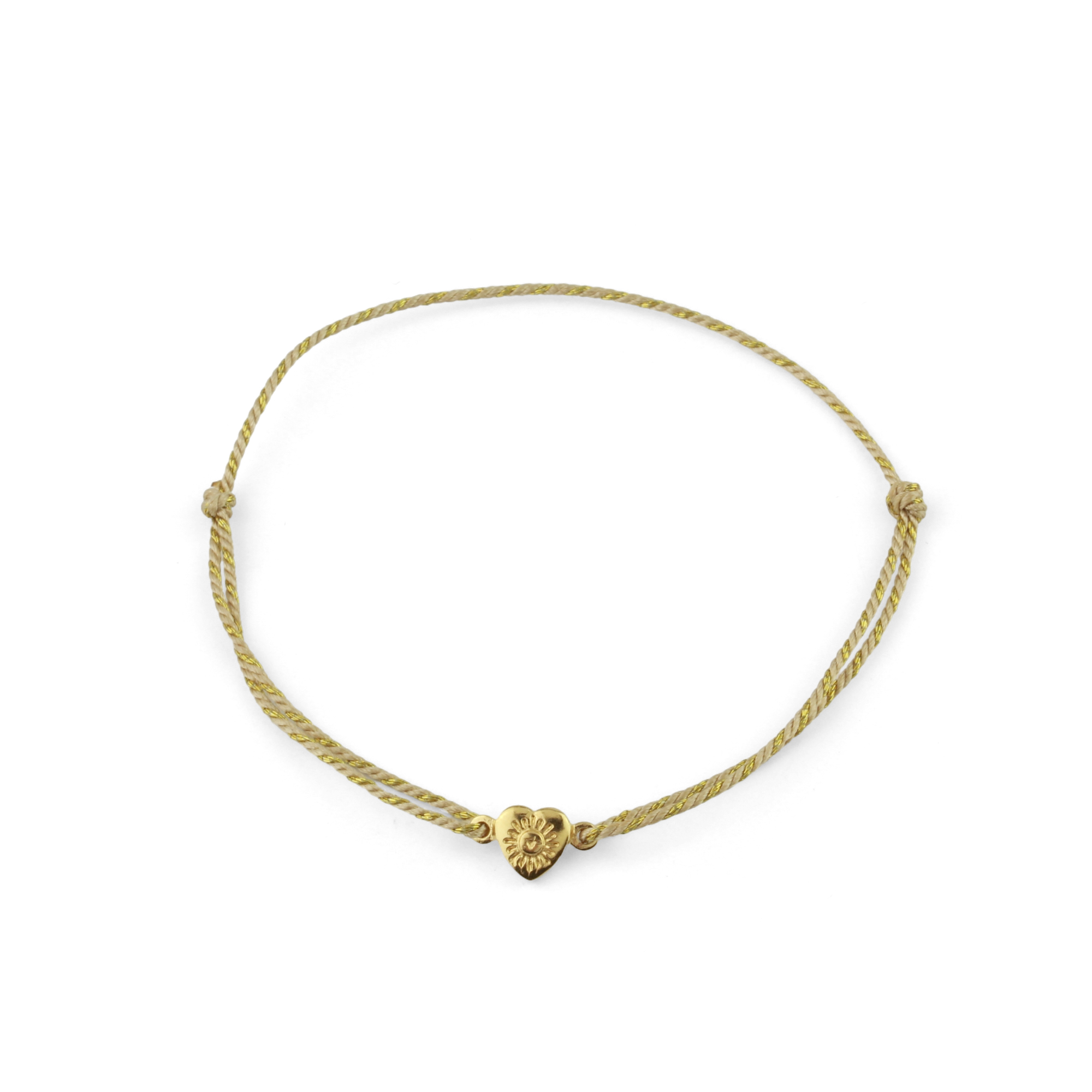 Bracelet composé d'un cordon résistant beige et doré et d'un petit cœur doré à l'or fin.