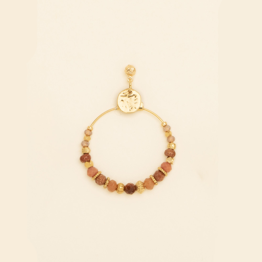 Les boucles d'oreilles Bell allient pierre fines et perles dorées de formes variées, montées sur un anneau rond de 3 cm de diamètre.