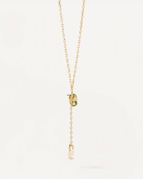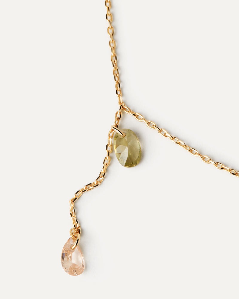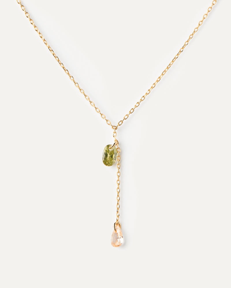 Collier chaîne Y plaqué or avec deux pendentifs de zircons en forme de goutte.