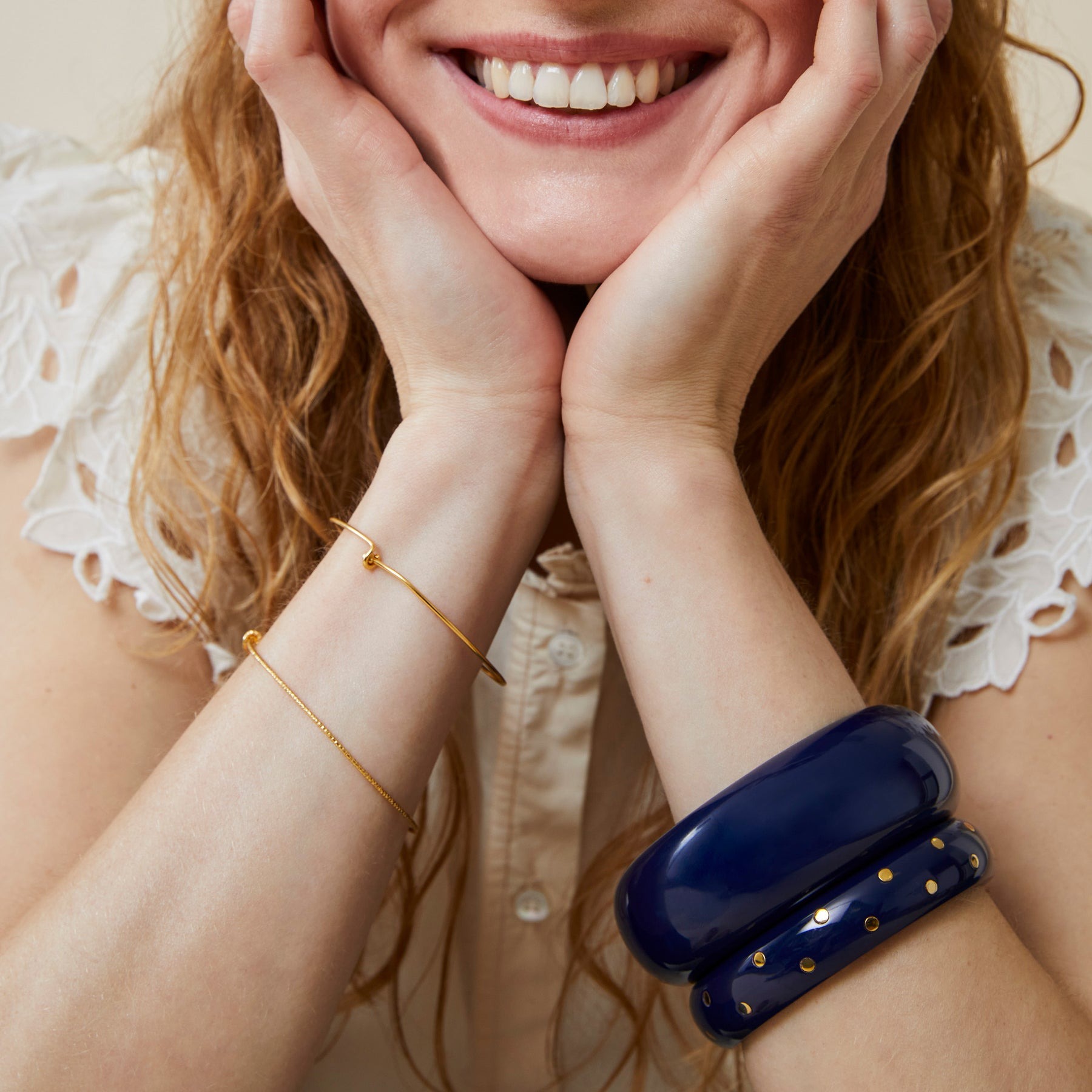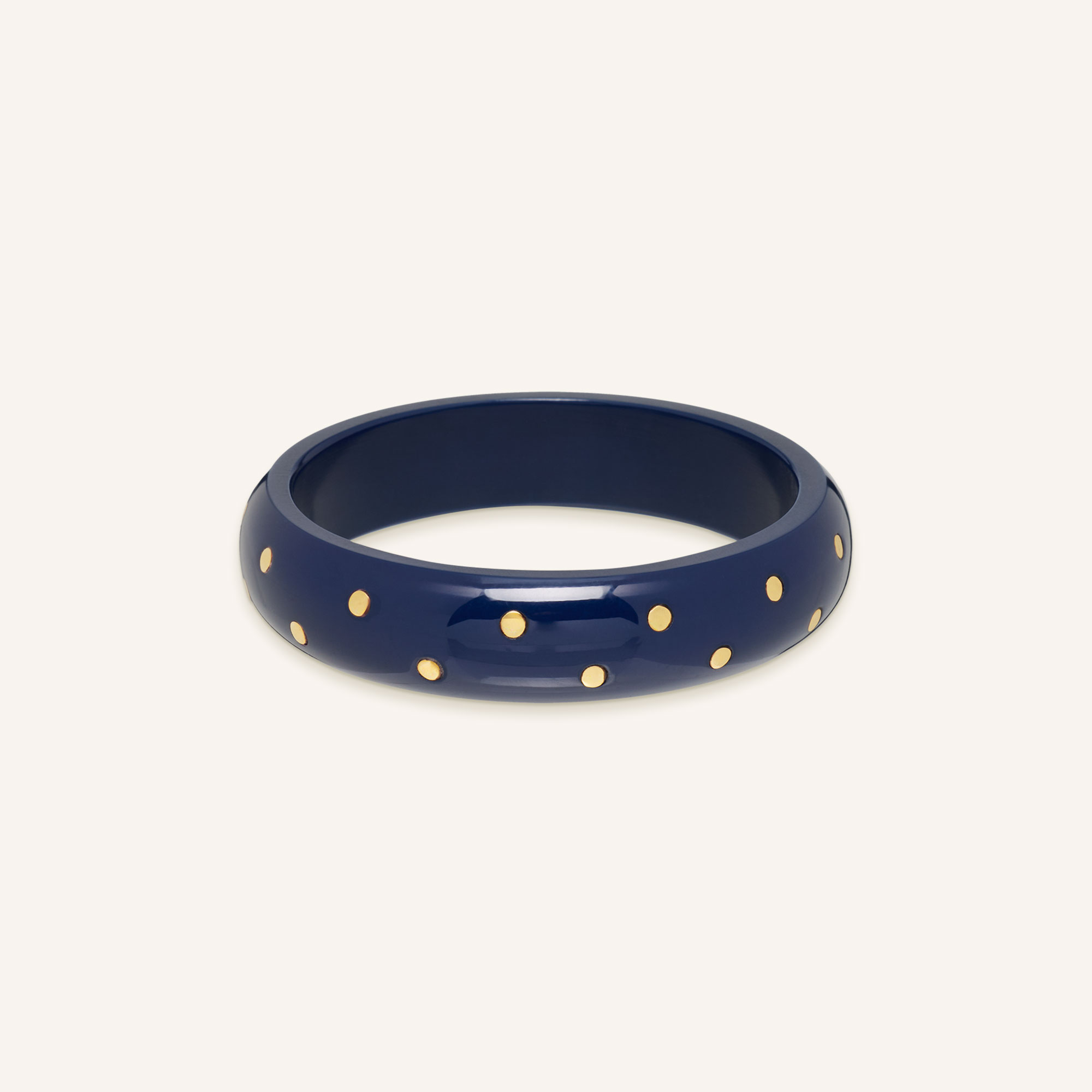 Jonc fermé arrondi en acétate de couleur. Détail pois en laiton doré incrustés.