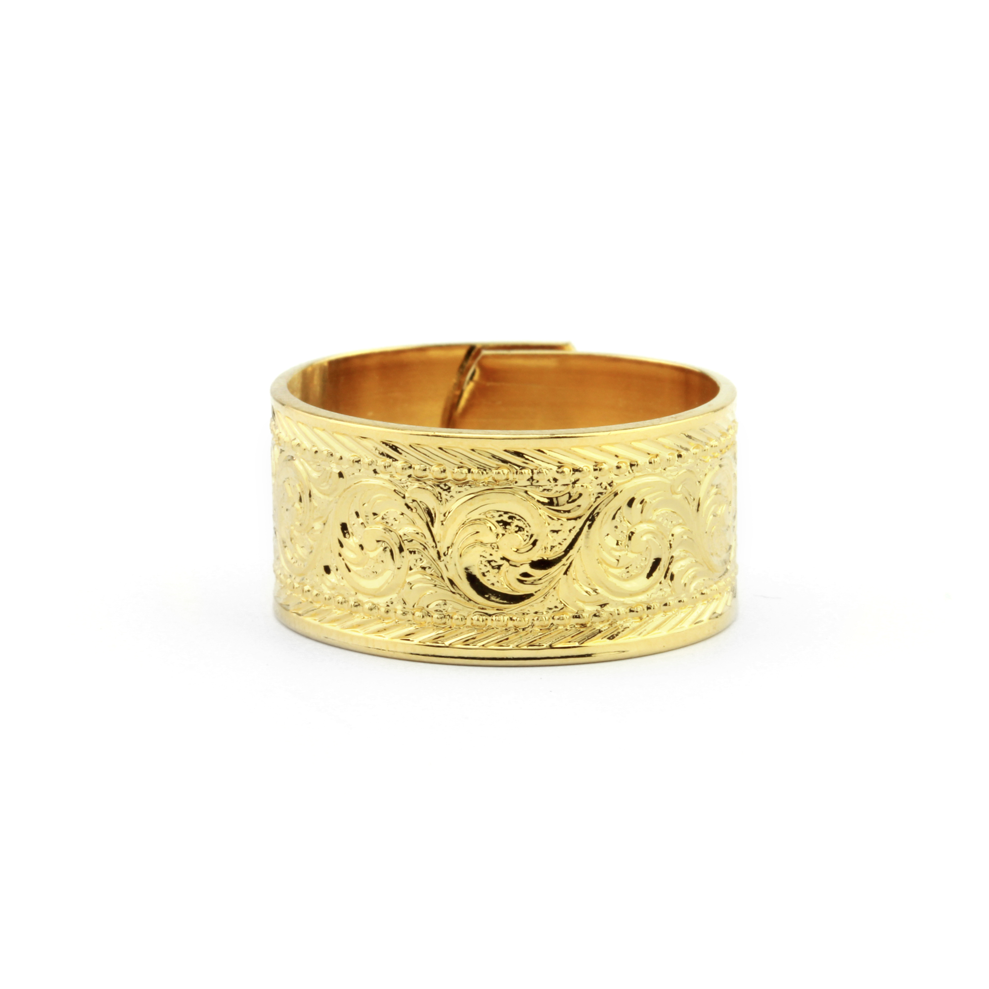 Anneau large avec motifs apposés sur l'ensemble de la bague.