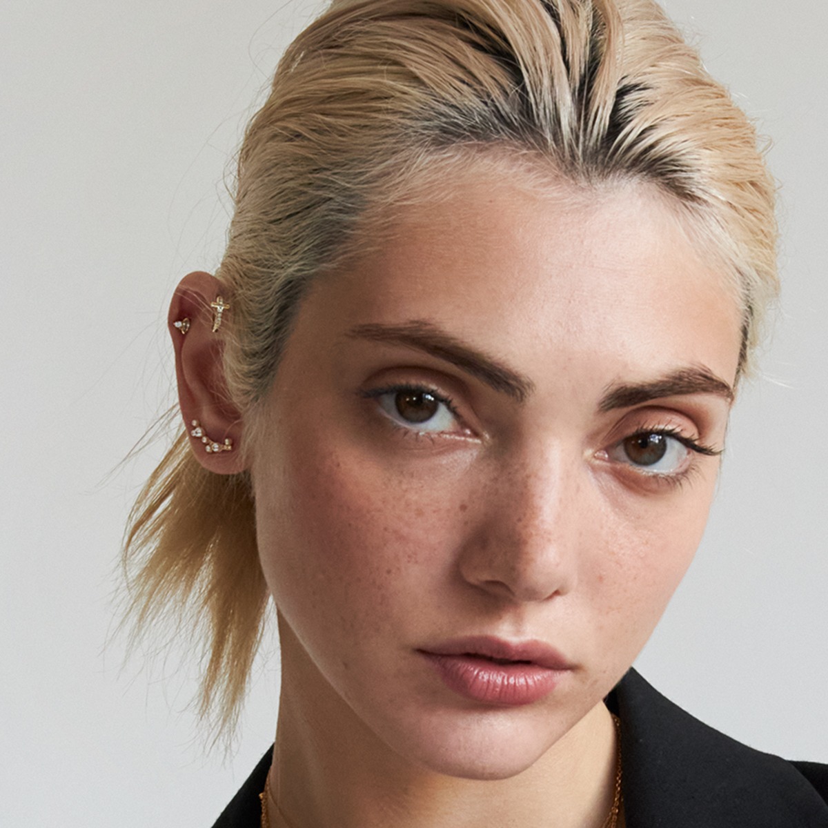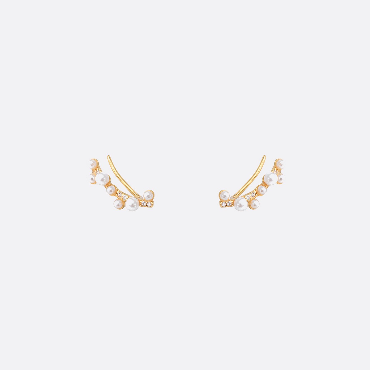 Le dessus d’oreilles Perla est doré à l’or fin 24 carats et orné d’oxydes de zirconium ainsi que des peites perles.
