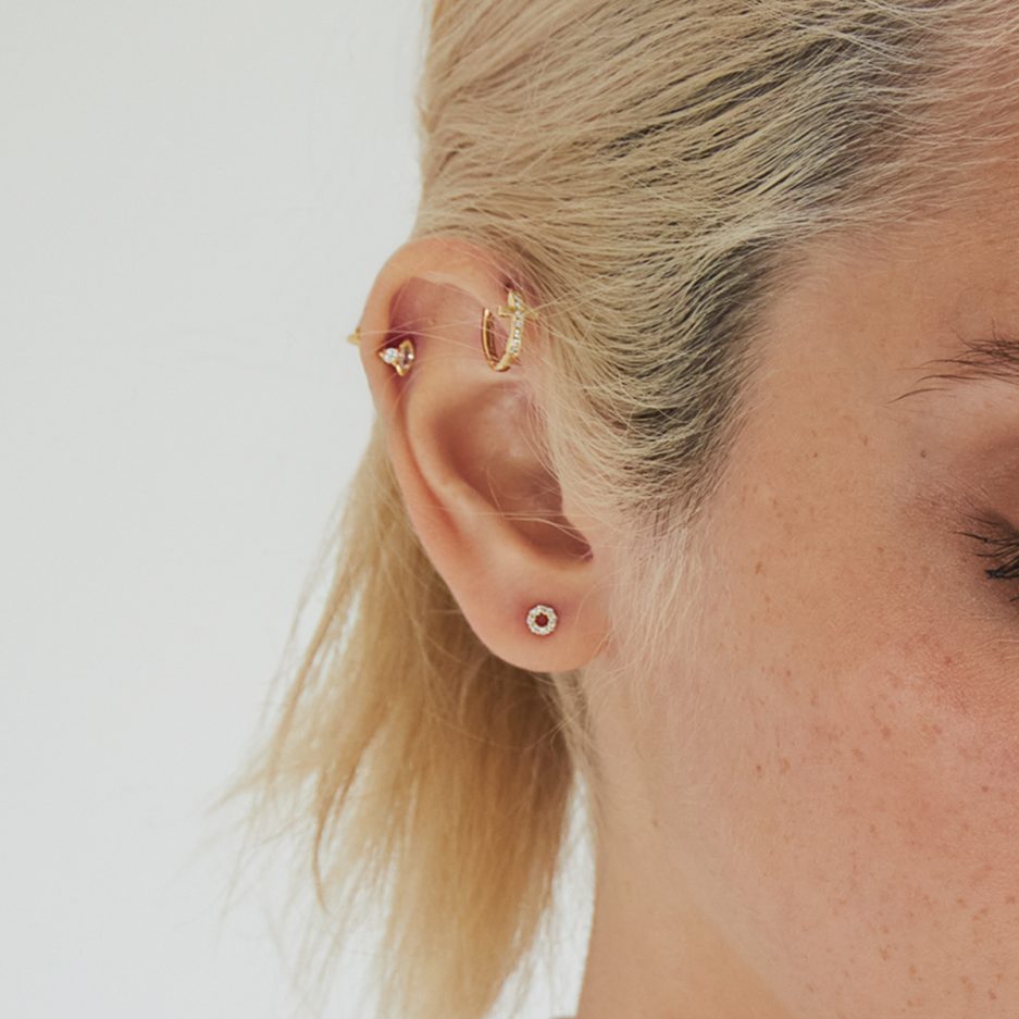 La puce d’oreille Etel est dorée à l’or fin 24 carats et est sertie d’oxydes de zirconium blancs.