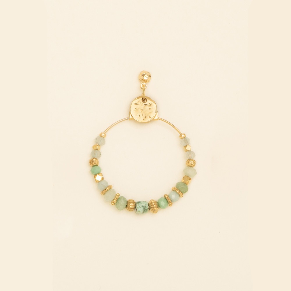 Les boucles d'oreilles Bell allient pierre fines et perles dorées de formes variées, montées sur un anneau rond de 3 cm de diamètre.