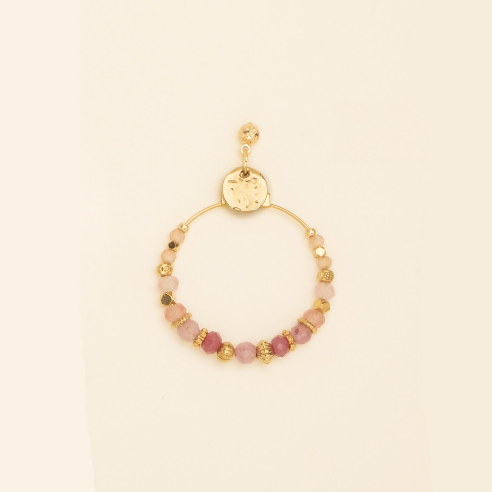 Les boucles d'oreilles Bell allient pierre fines et perles dorées de formes variées, montées sur un anneau rond de 3 cm de diamètre.