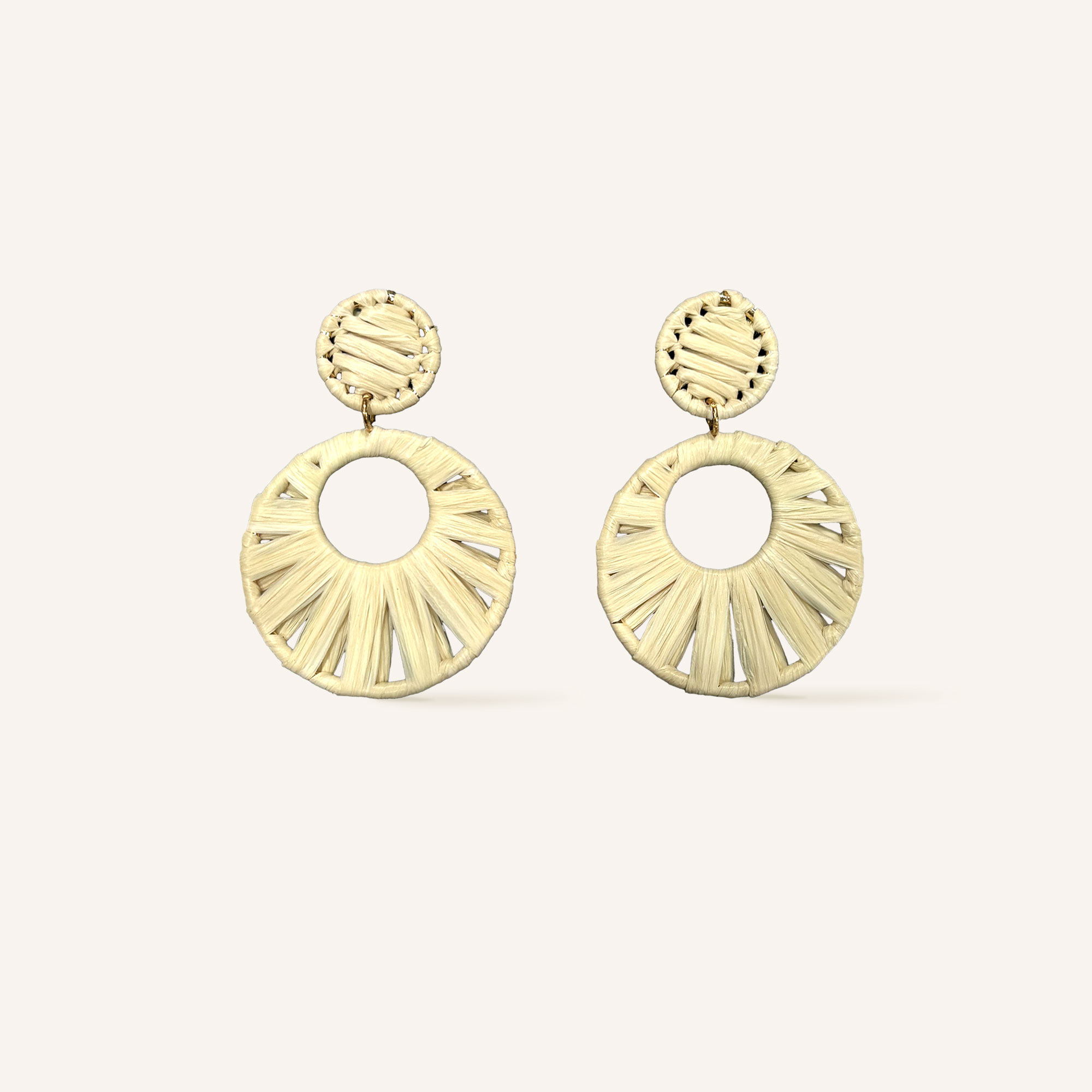 Détail pendentif rond en raphia tissés à la main.