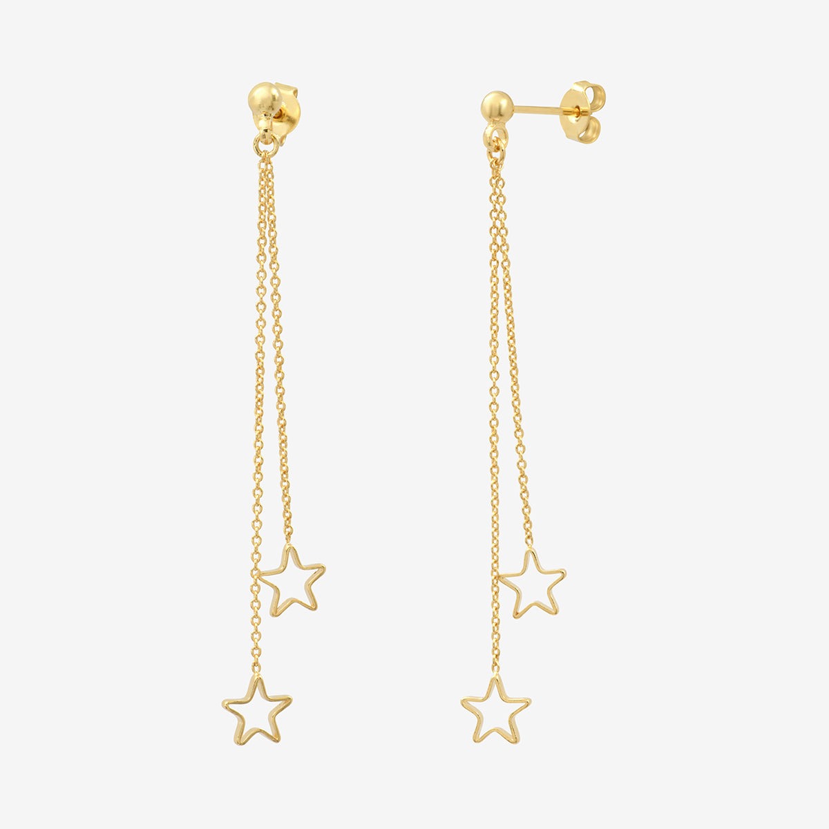 Ces boucles d'oreilles se distinguent par leur design délicat, composé de chaînes fines ornées de petites étoiles creuses.