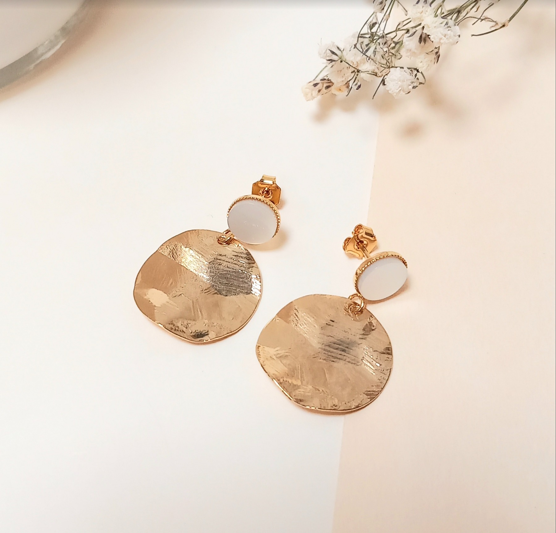 Boucles d’oreilles dorées à l’or fin 24K composées d’une pastille ornée d’une pierre fine à laquelle est rattachée une plaque de forme ronde et martelée.