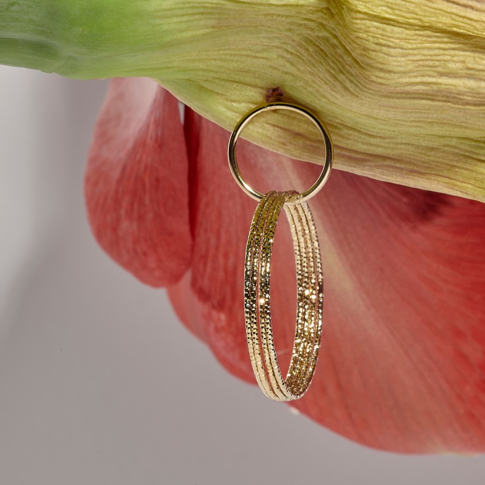 Les Boucles d'oreilles Gabi se composent de 4 anneaux striés enlacés sur une créole dorée.