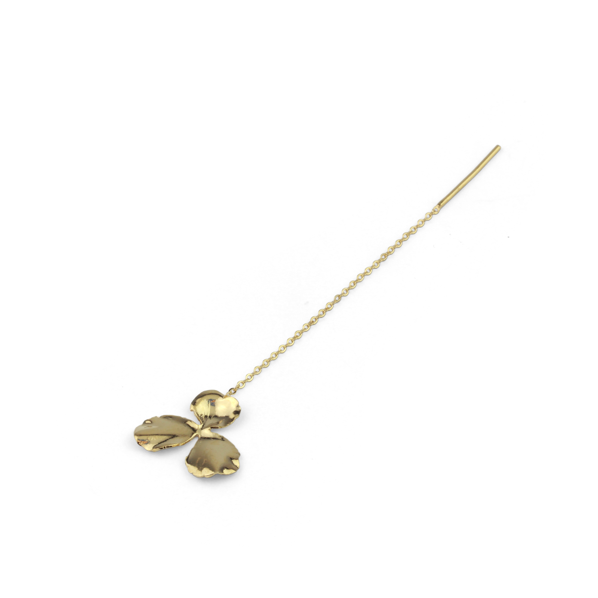 La boucle d'oreille Juliette est composée d'une fine tige, d'une chaine qui se tremine par un fleur de pensée.