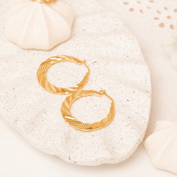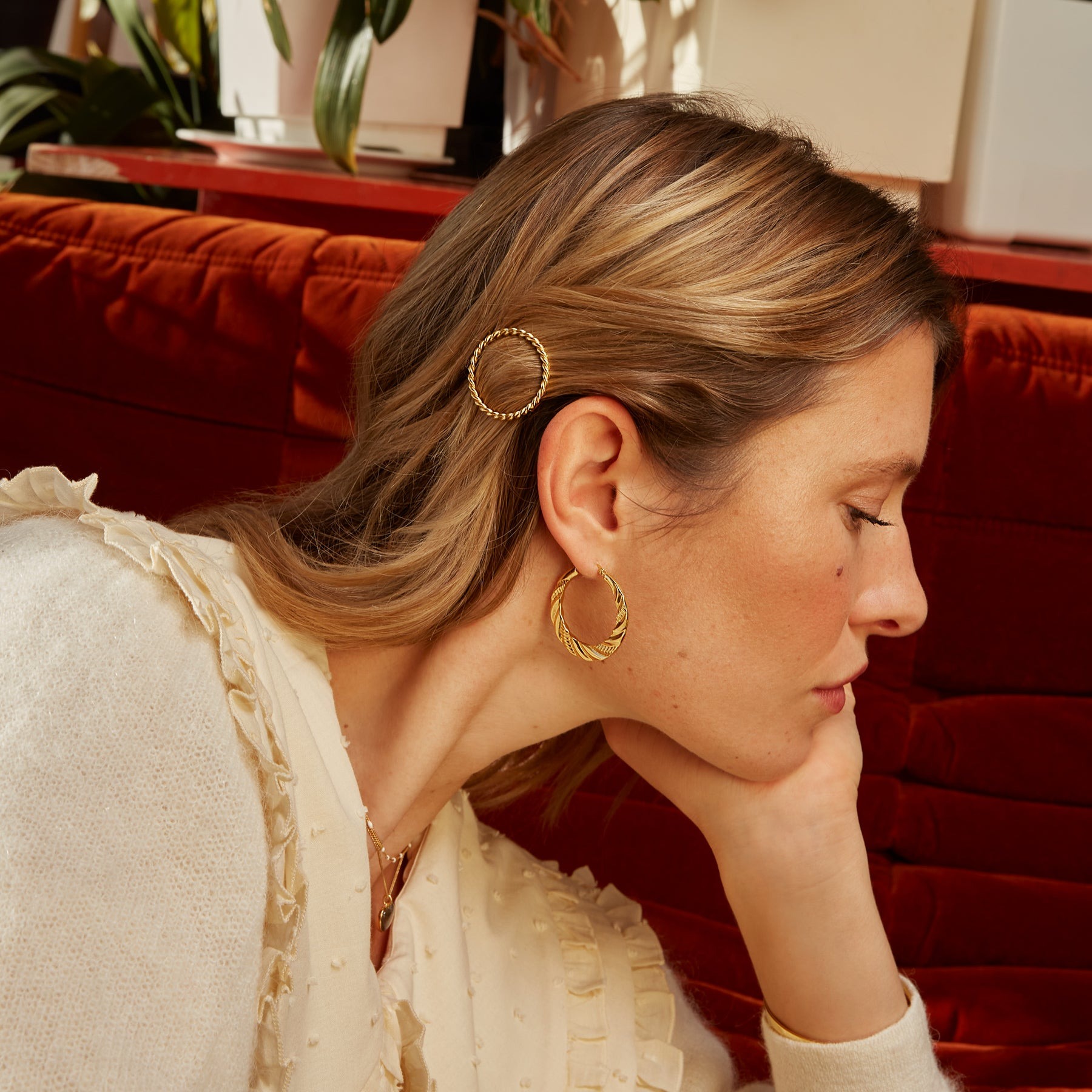 Les boucles Lisette sont des créoles fermées. Détail anneau plat gravé et texturé.