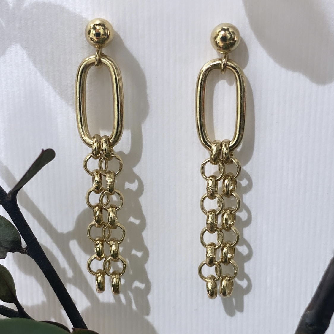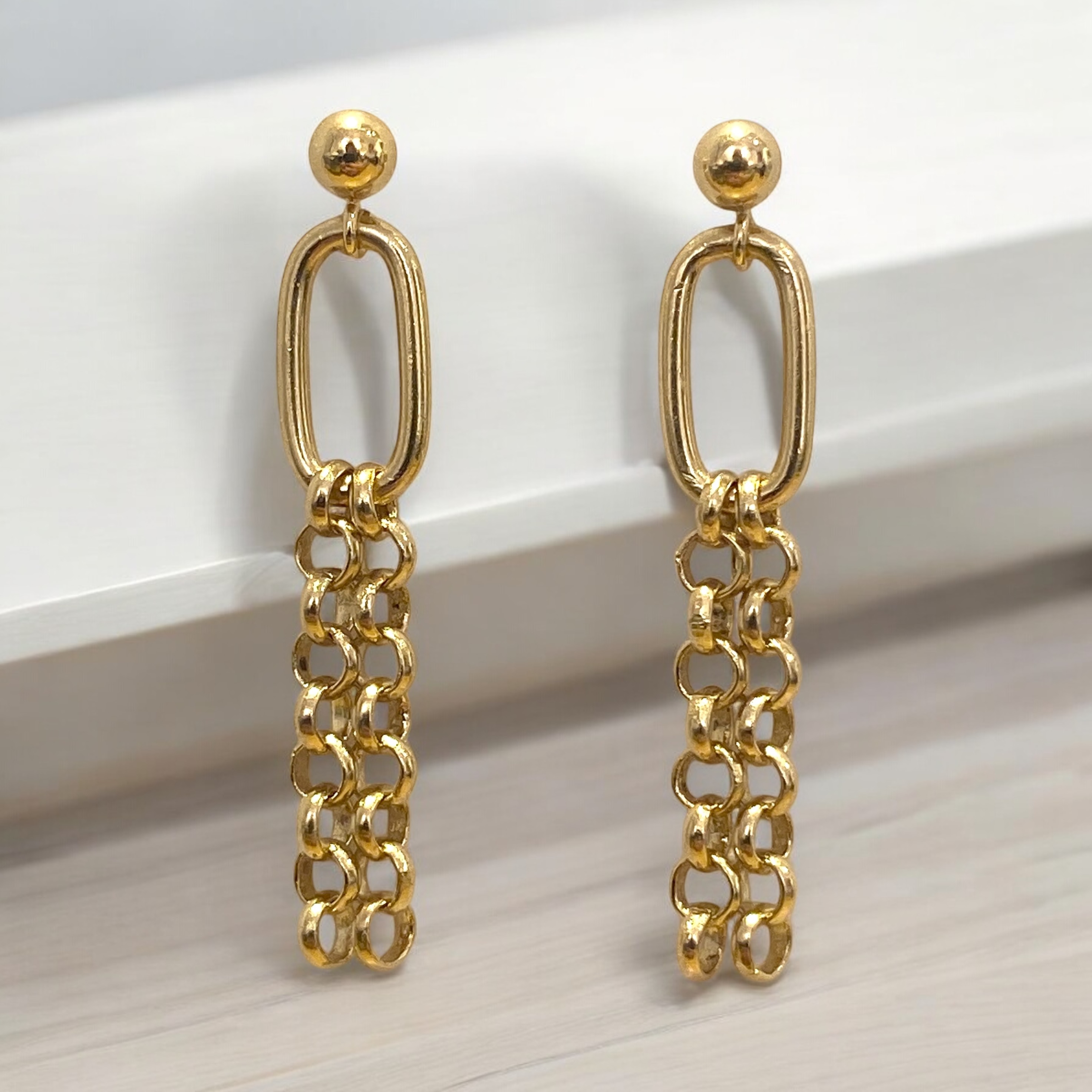 Les boucles d'oreilles Pauline sont des puces composées d'une petite bille d'un maillon rectangle et de 2 chaines attenant au maillon.