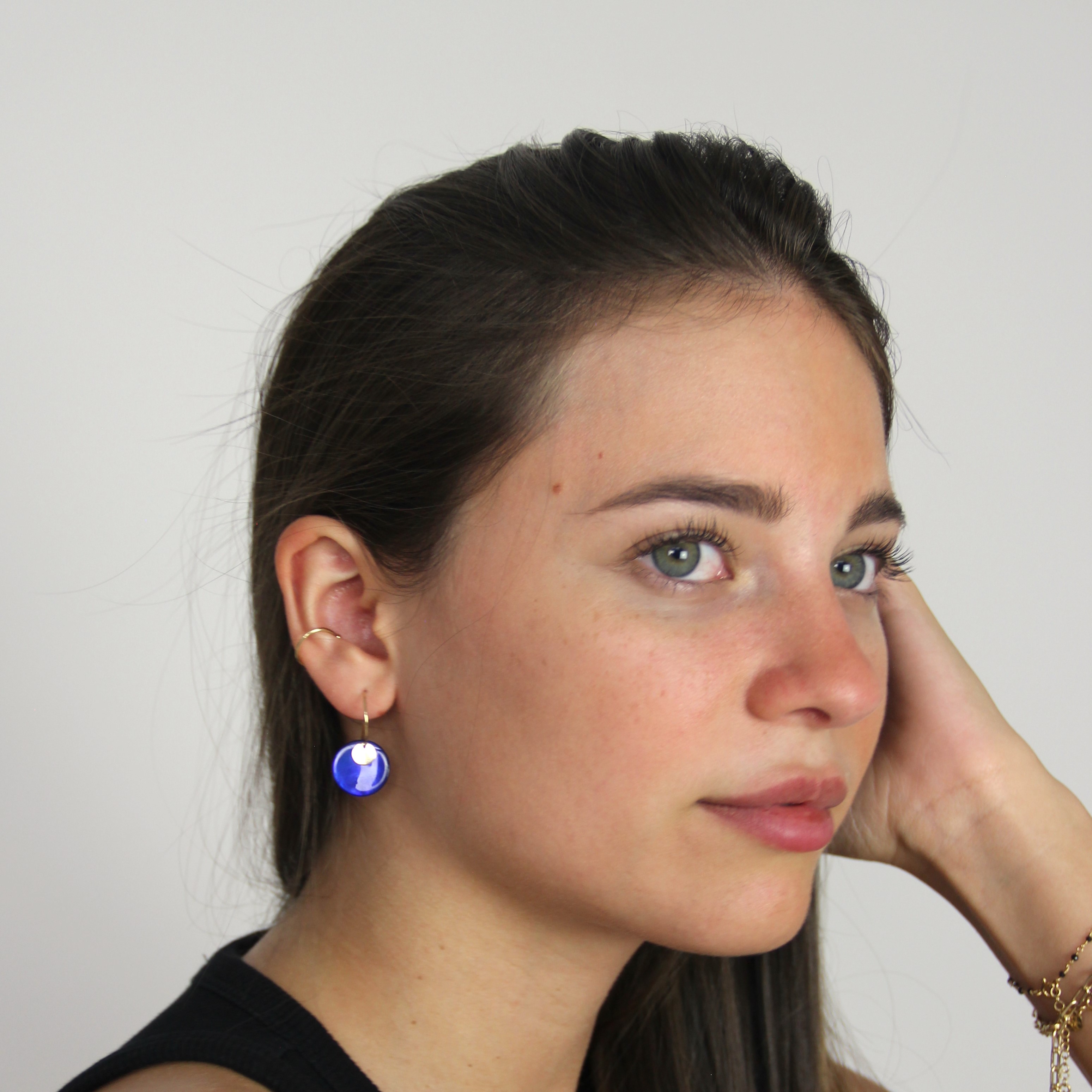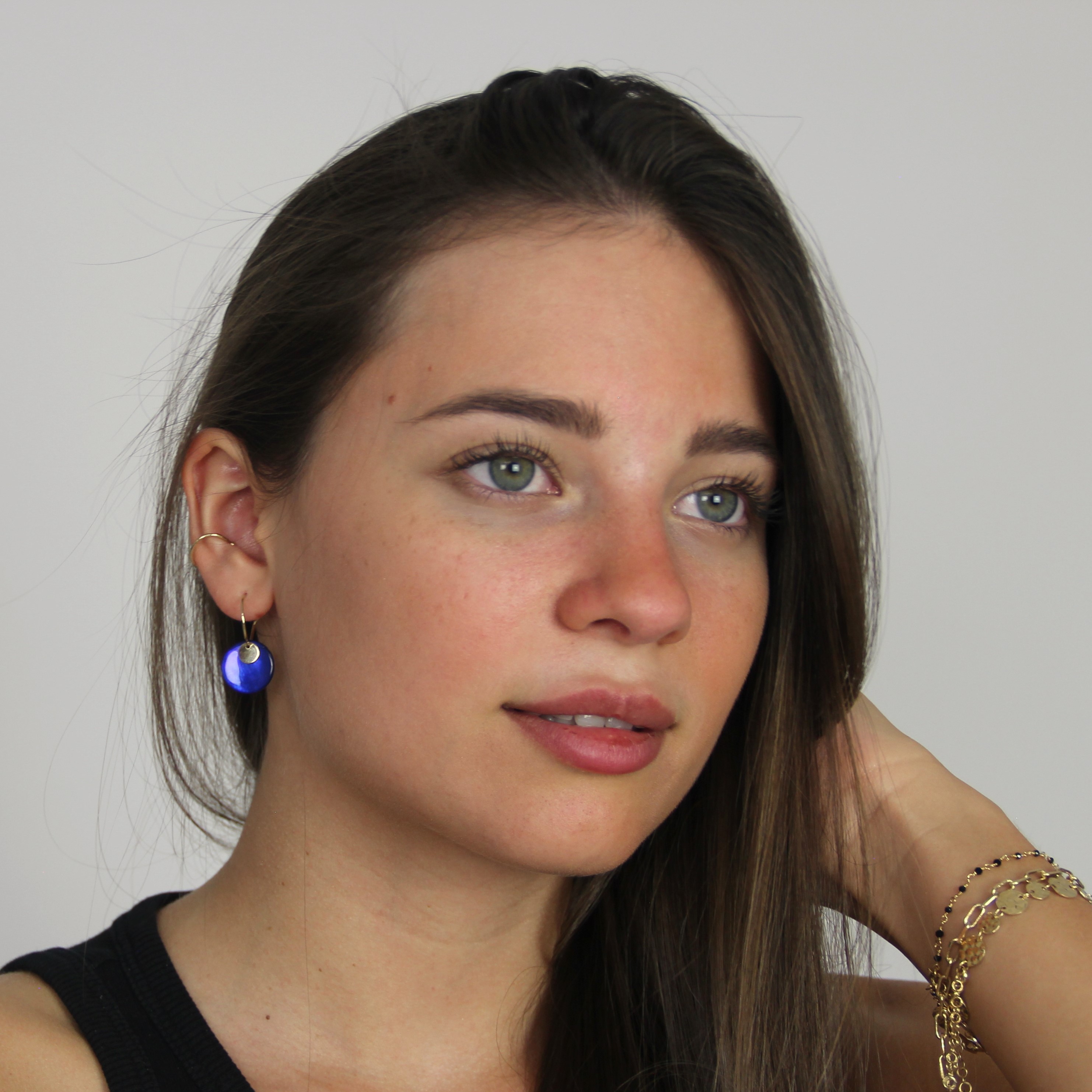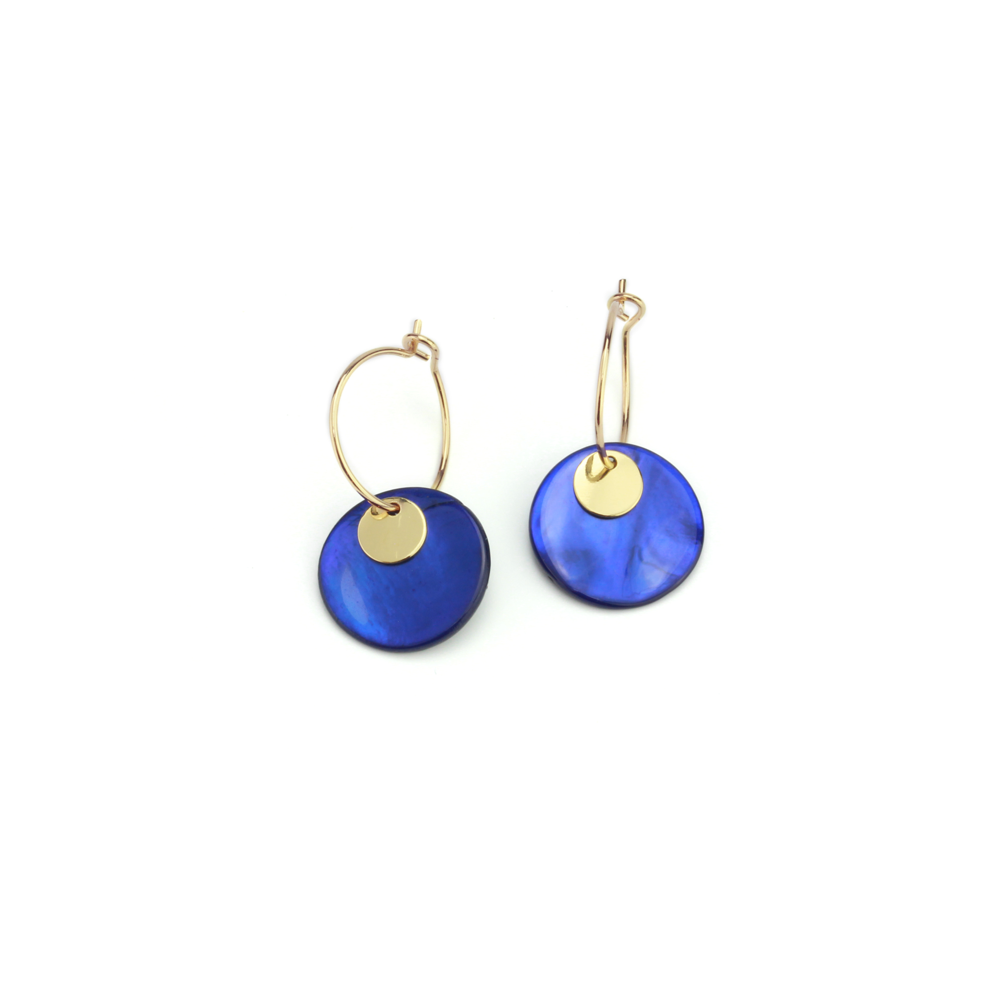 Les boucles d'oreilles Shell sont des créoles composées d'une pastille en nacre teintée et d'une petite pastille dorée.