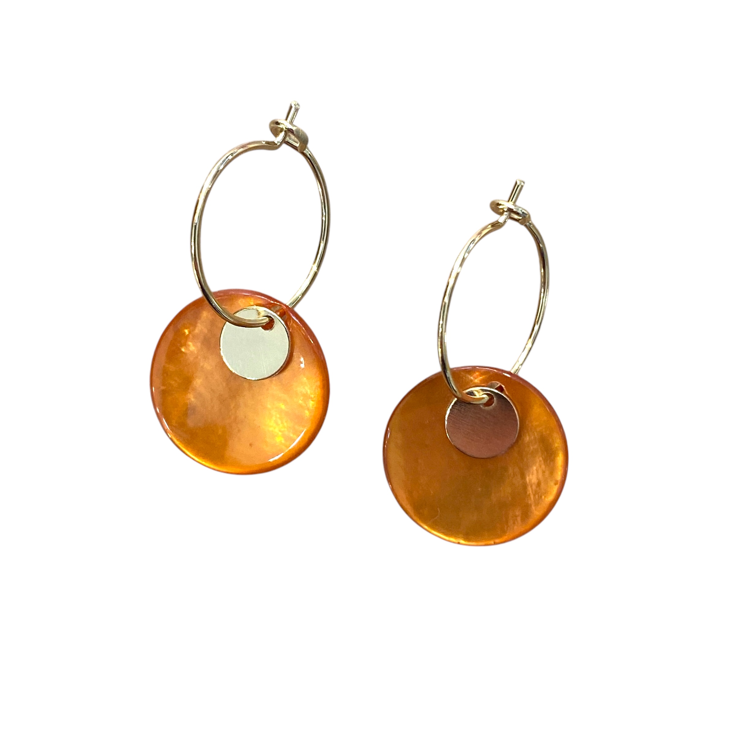 Les boucles d'oreilles Shell sont des créoles composées d'une pastille en nacre teintée et d'une petite pastille dorée.