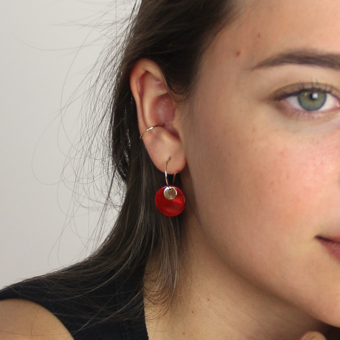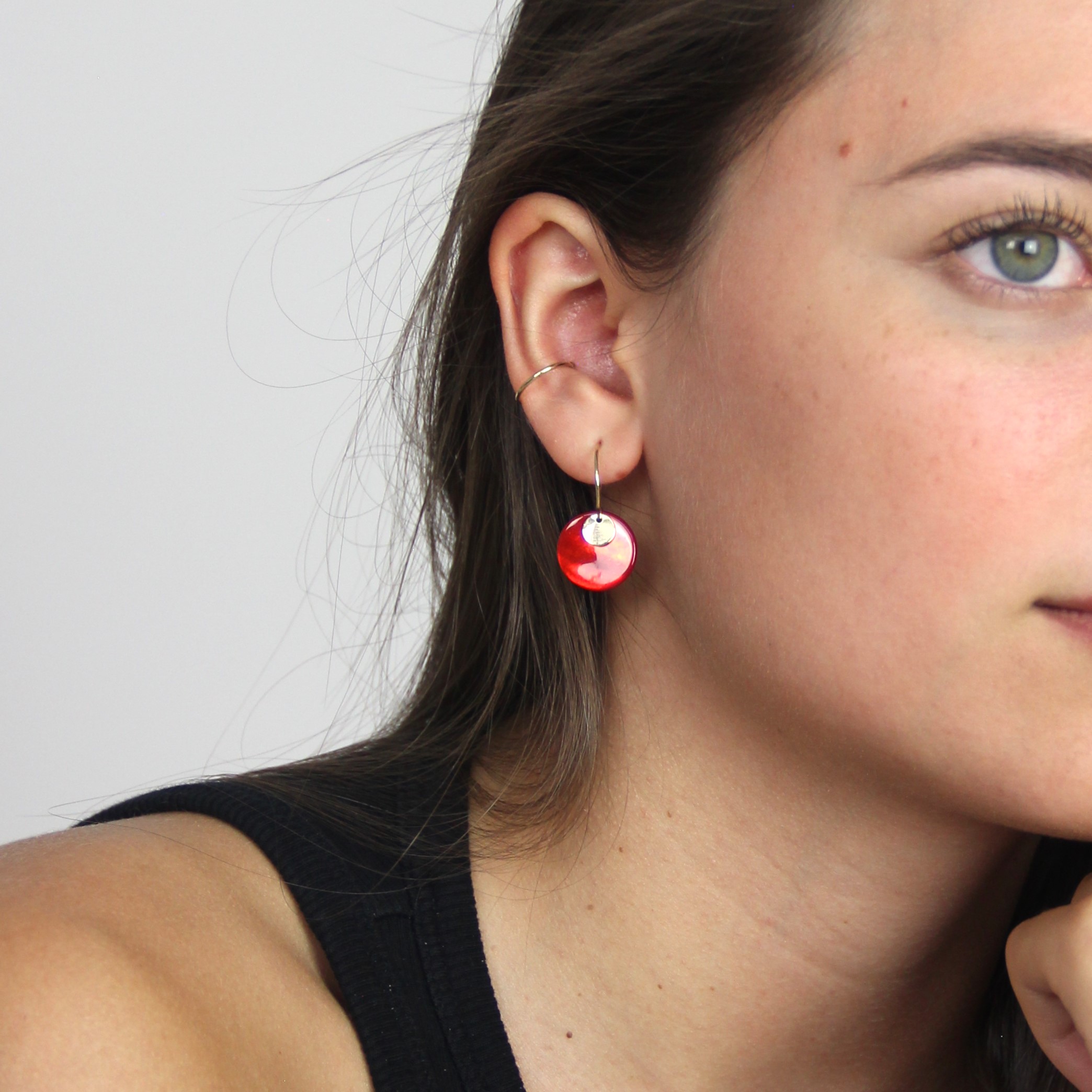Les boucles d'oreilles Shell sont des créoles composées d'une pastille en nacre teintée et d'une petite pastille dorée.