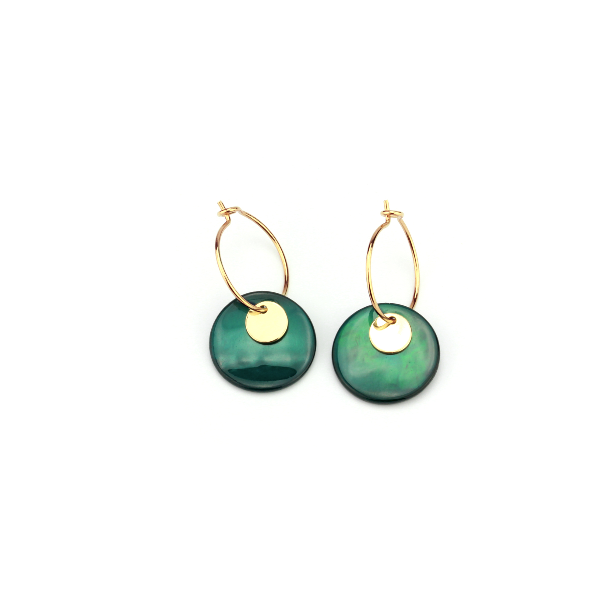 Les boucles d'oreilles Shell sont des créoles composées d'une pastille en nacre teintée et d'une petite pastille dorée.