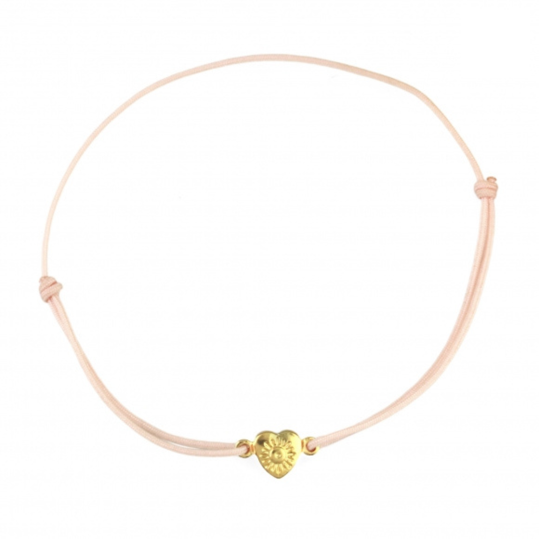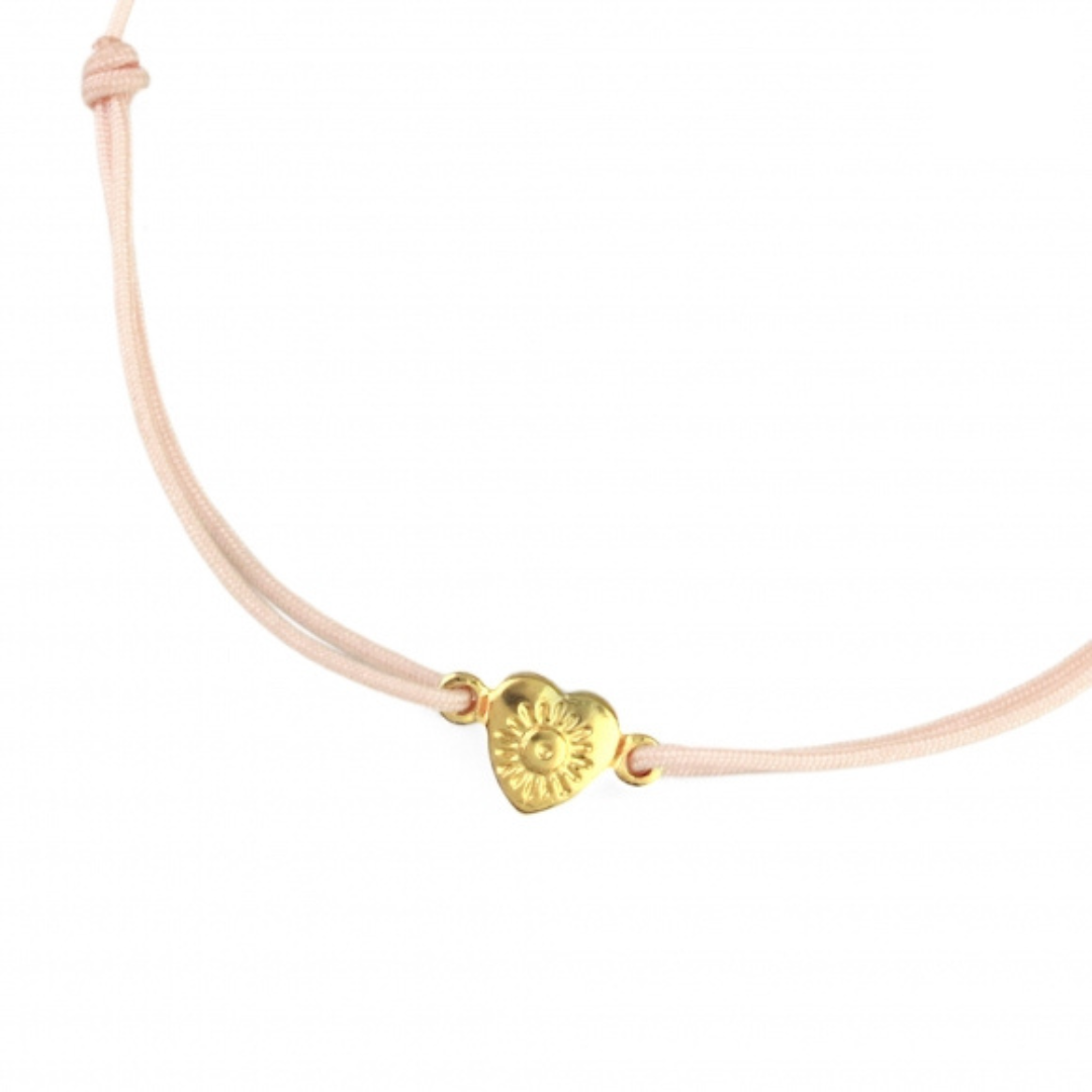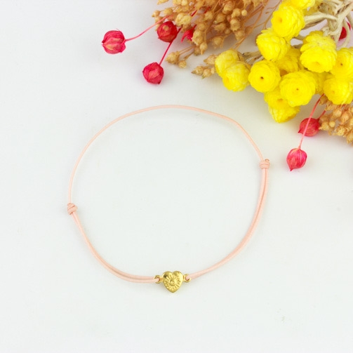 Bracelet composé d'un cordon résistant rose nude et d'un petit cœur doré à l'or fin.