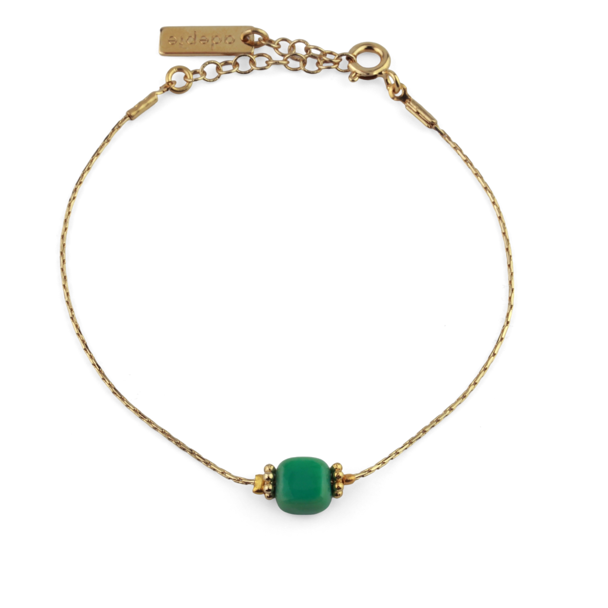 Élégance et raffinement. Le bracelet stone est composé d'une chaîne très fine, d'une pierre carrée encadrée par 2 rondelles dorées à l'or fin.