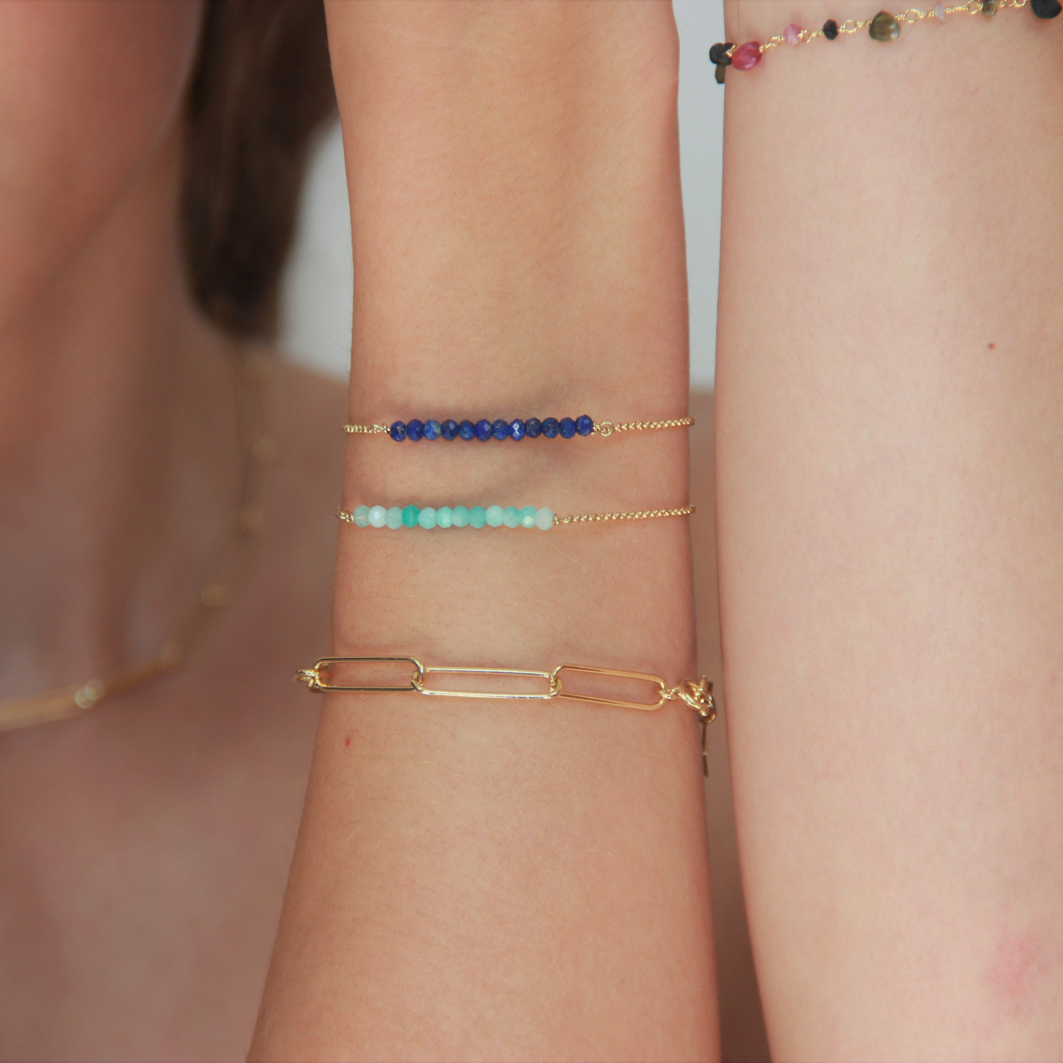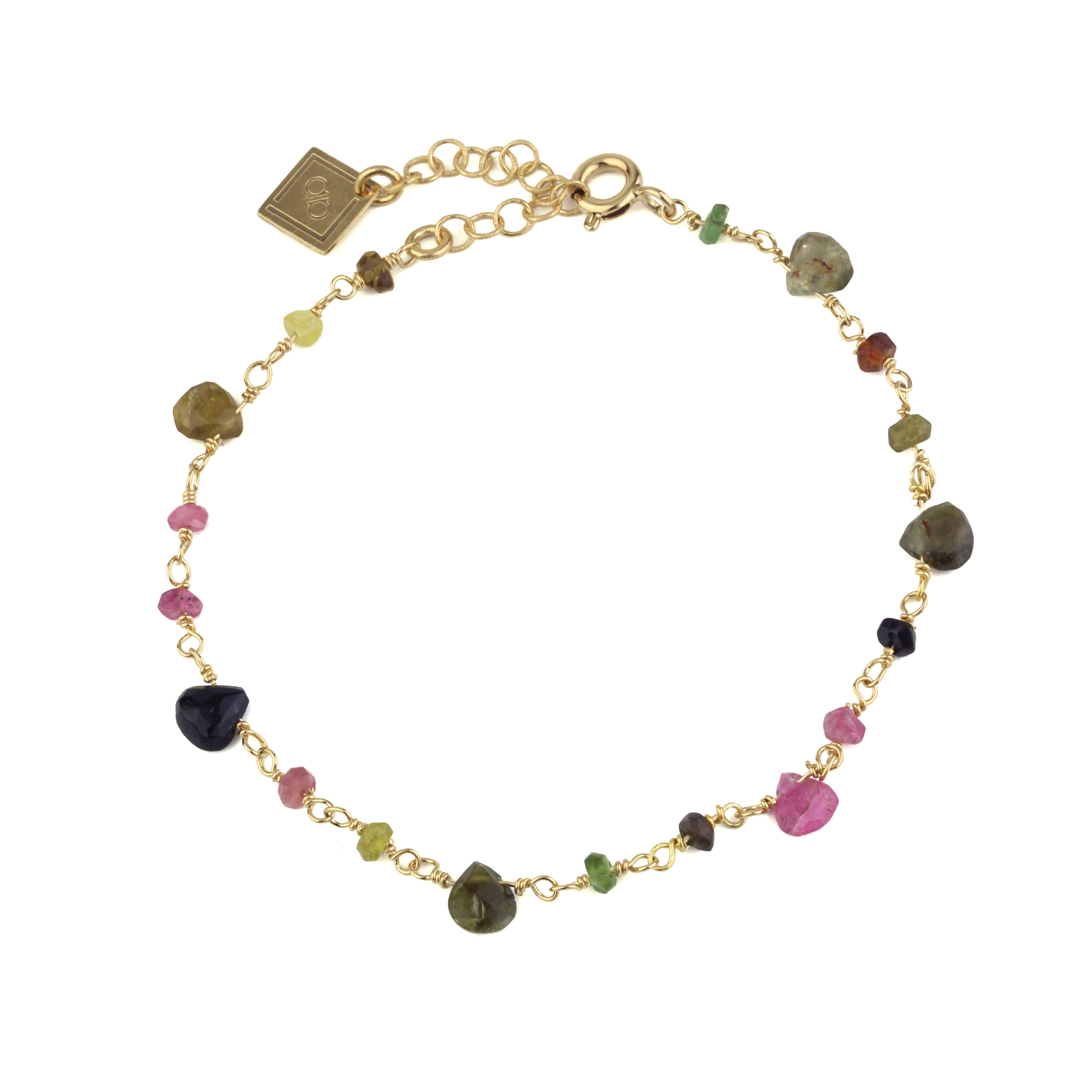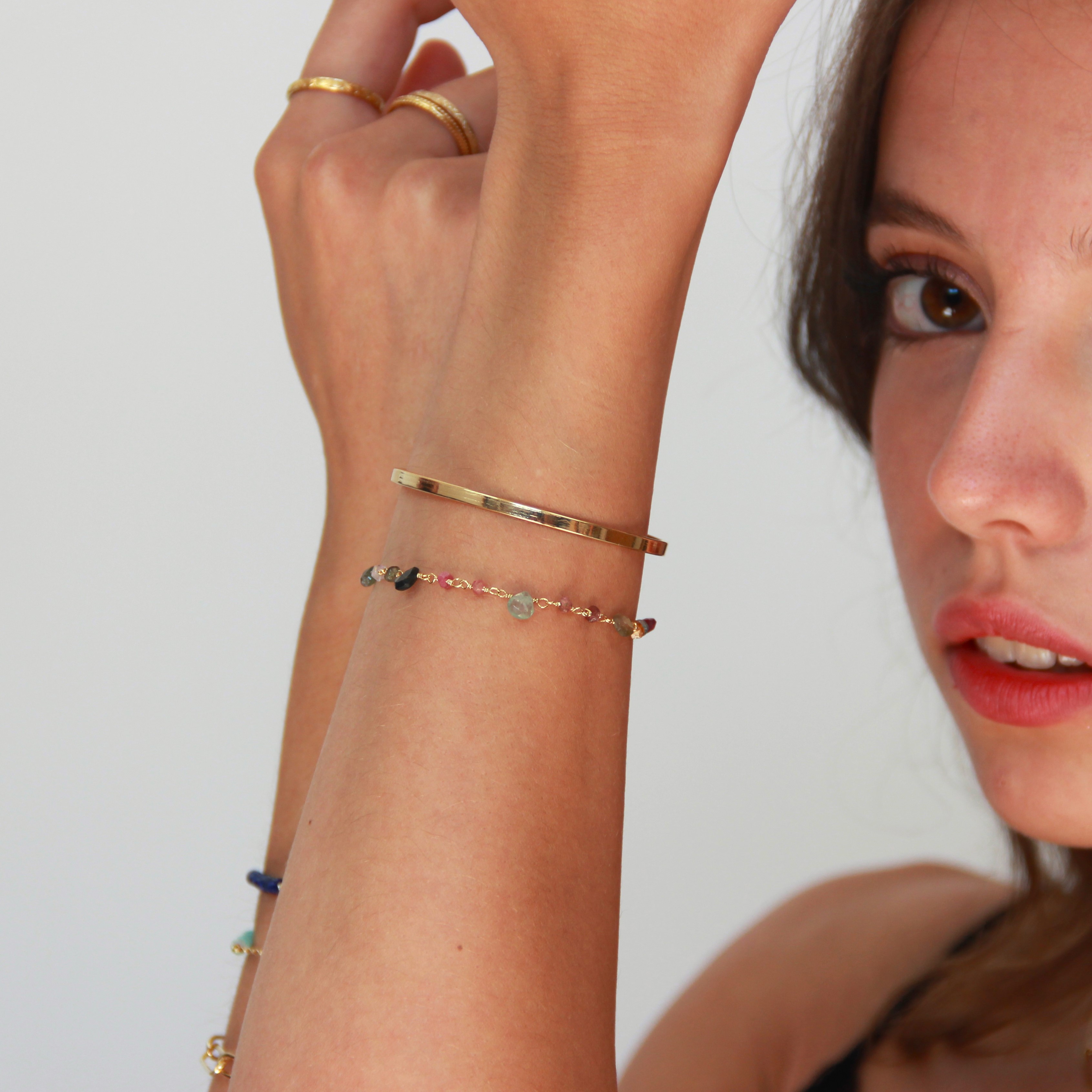Ce bijou est personnalisableBracelet Chamarel, composé d'une chaîne dorée à l'or fin et de petites tourmalines de toutes les couleurs : rose, verte et noir...