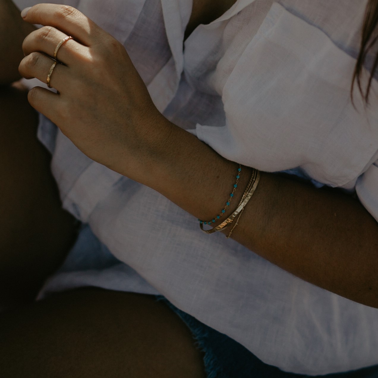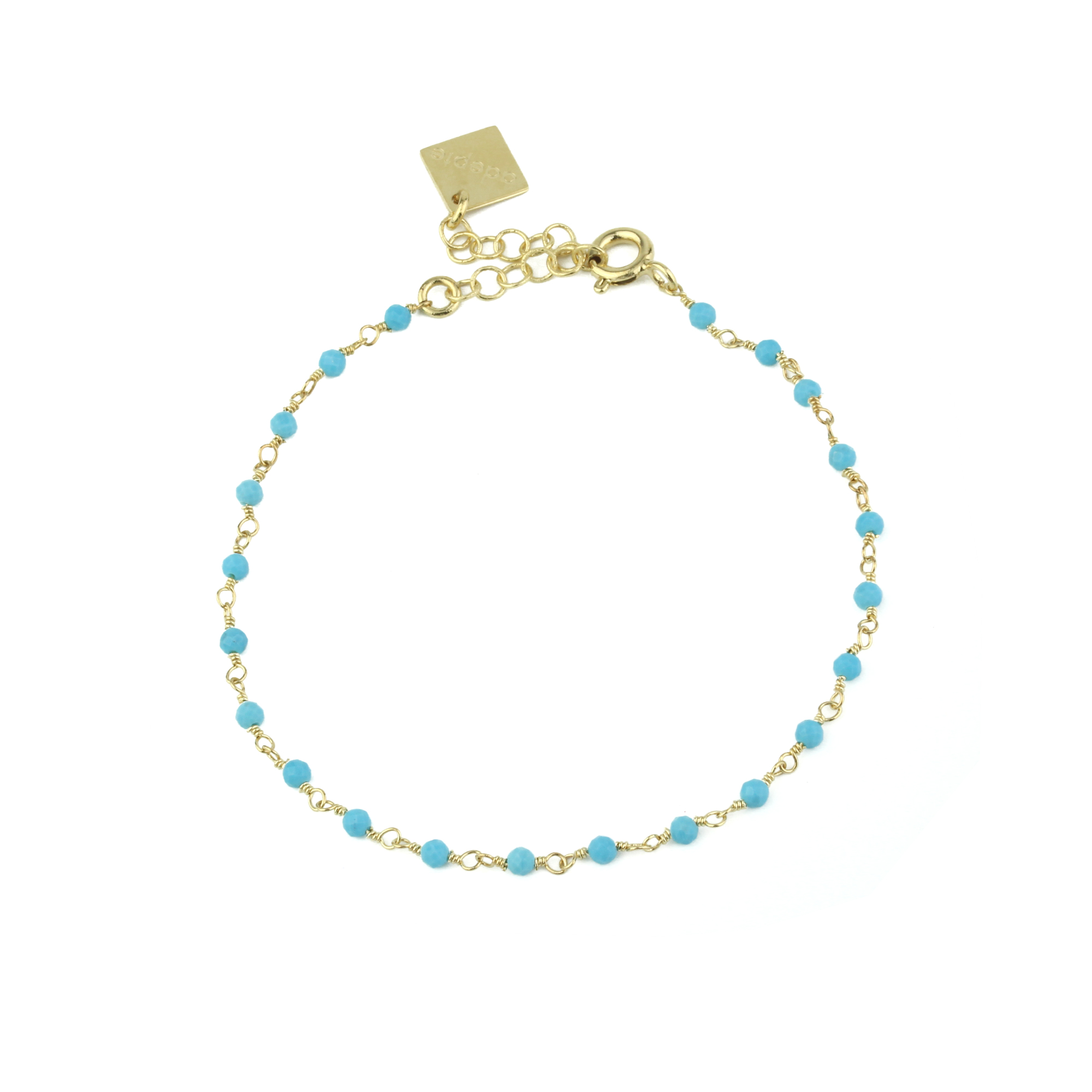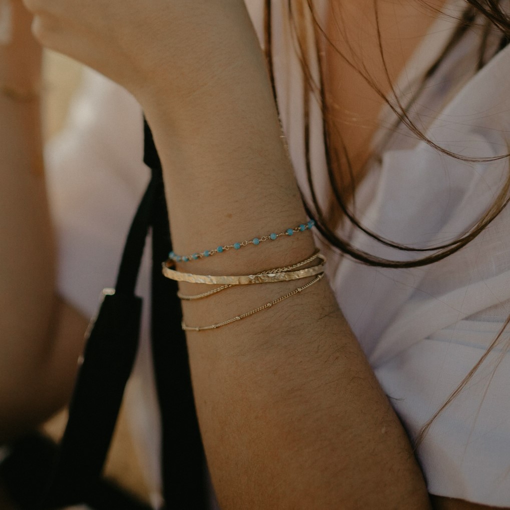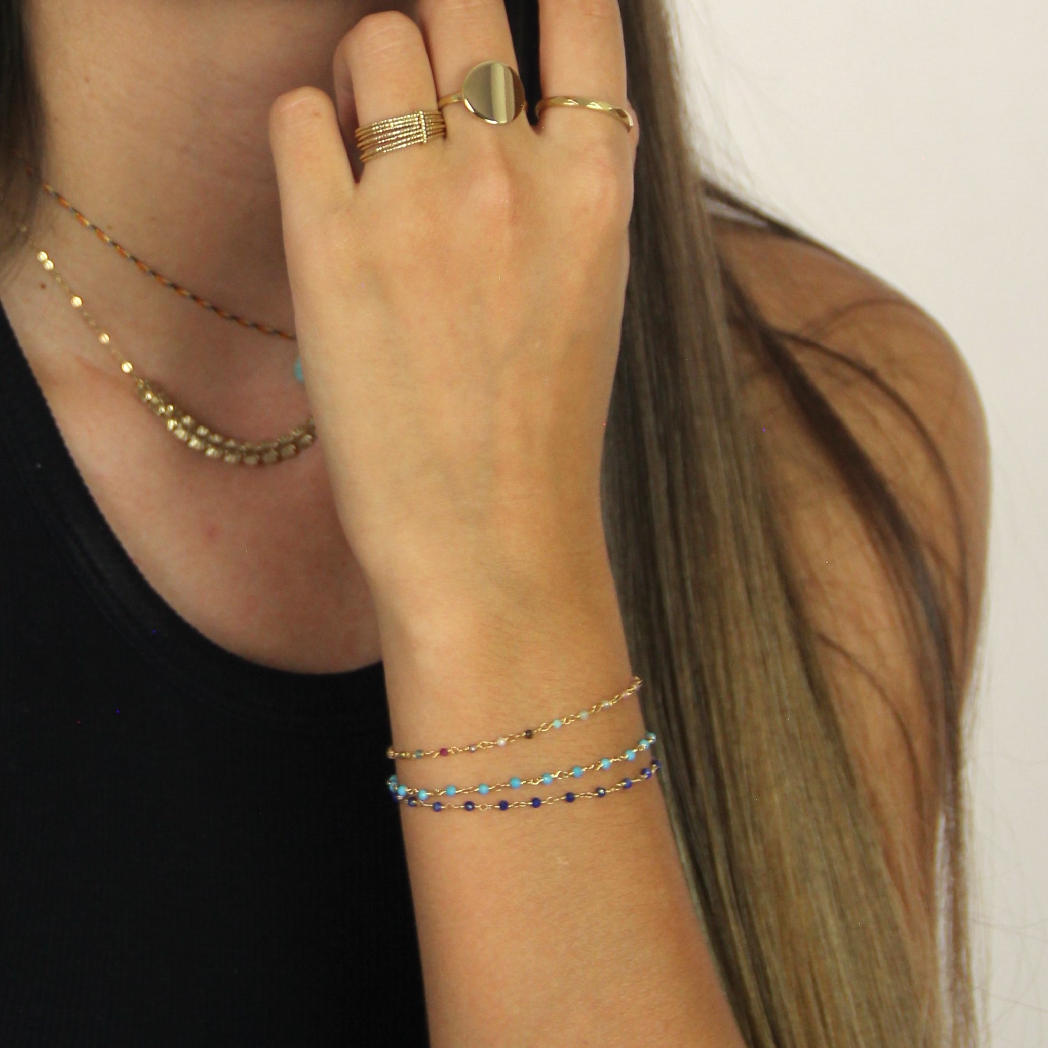 La chaine, fabriquée artisanalement est composée d’un fil doré à l’or fin et de pierres fines. Le bracelet est ajustable.
