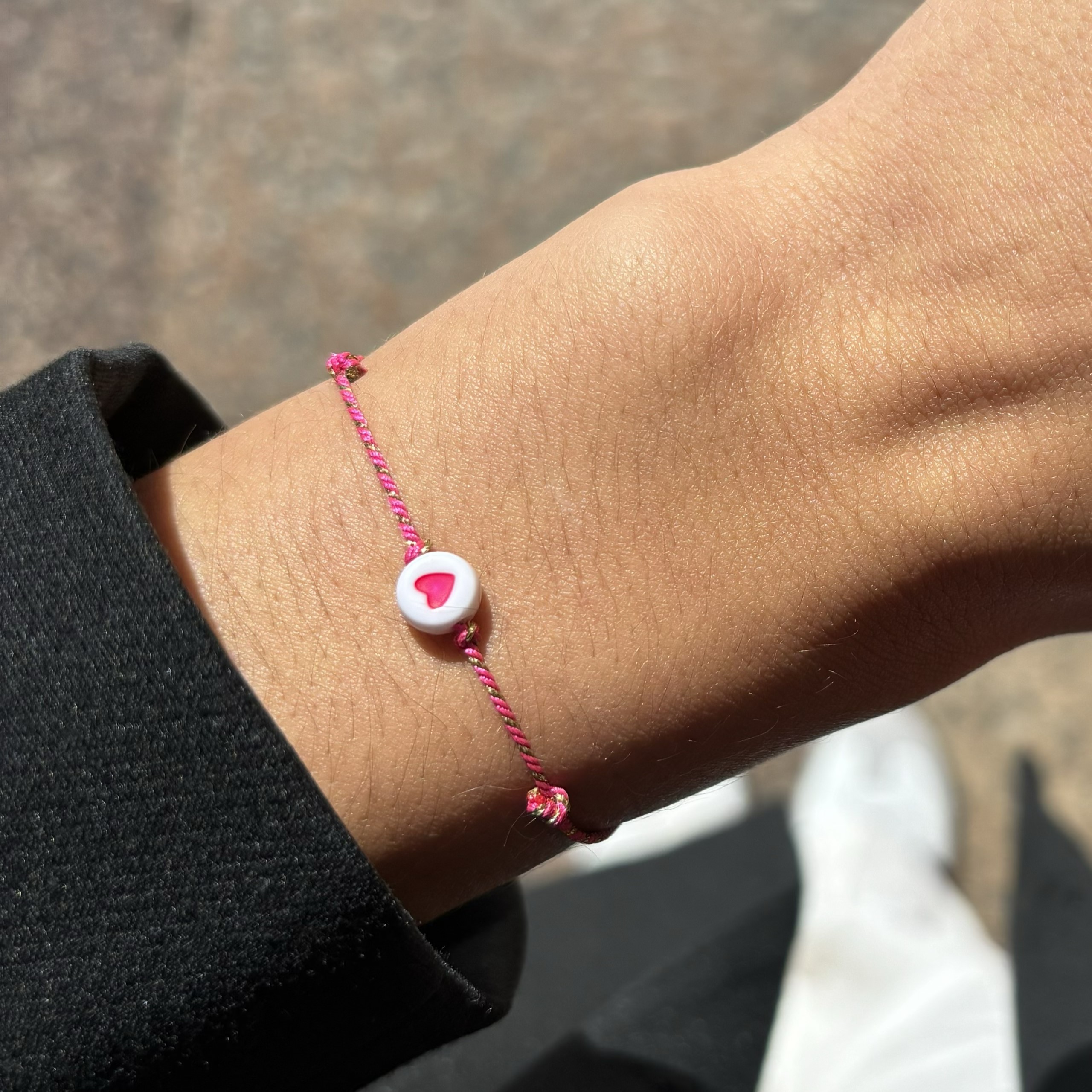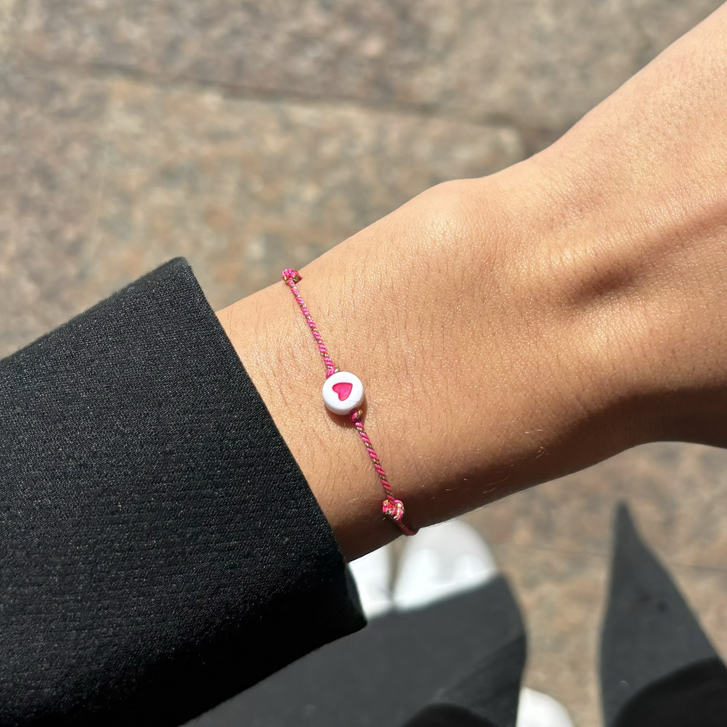 Le bracelet Octobre Rose se compose d'un cordon en polyester et et d'un petit coeur rose en acrylique.