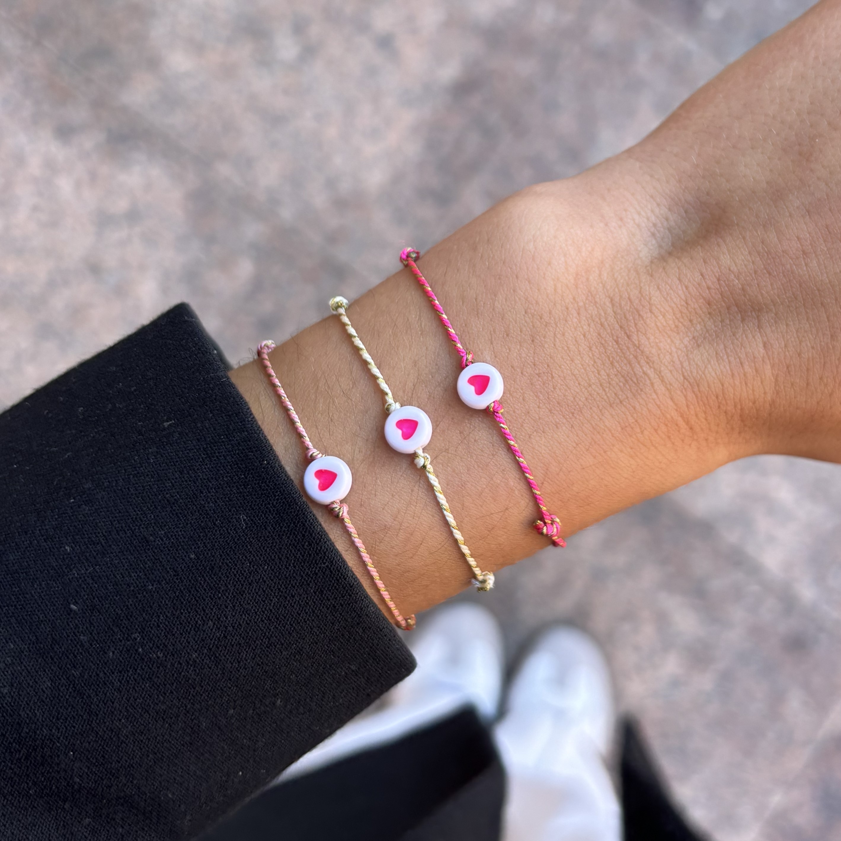 Le bracelet Octobre Rose se compose d'un cordon en polyester et et d'un petit coeur rose en acrylique.