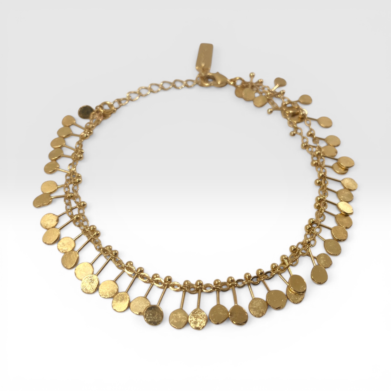 Bracelet composé de 2 chaînes aved des petites pampilles superposées l'unes sur l'autre.