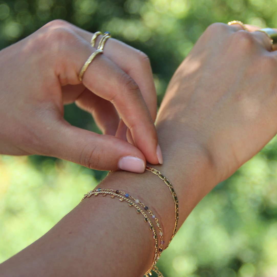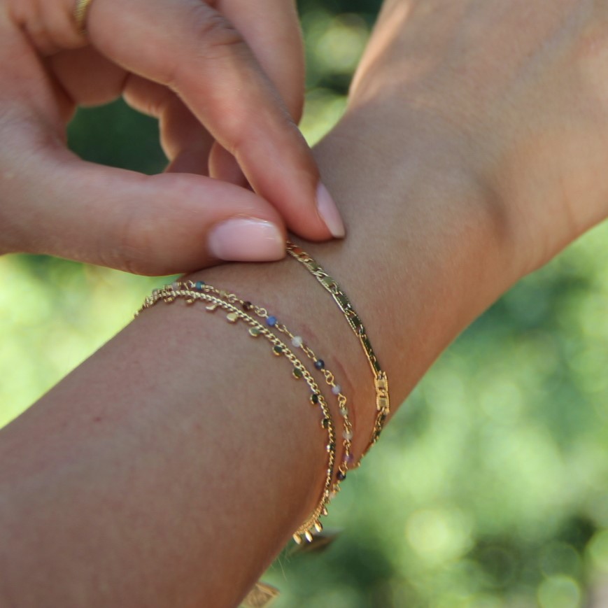 Le bracelet Pépites est composé d'une fine chaîne ainsi que de petites pastilles sur tout le long.