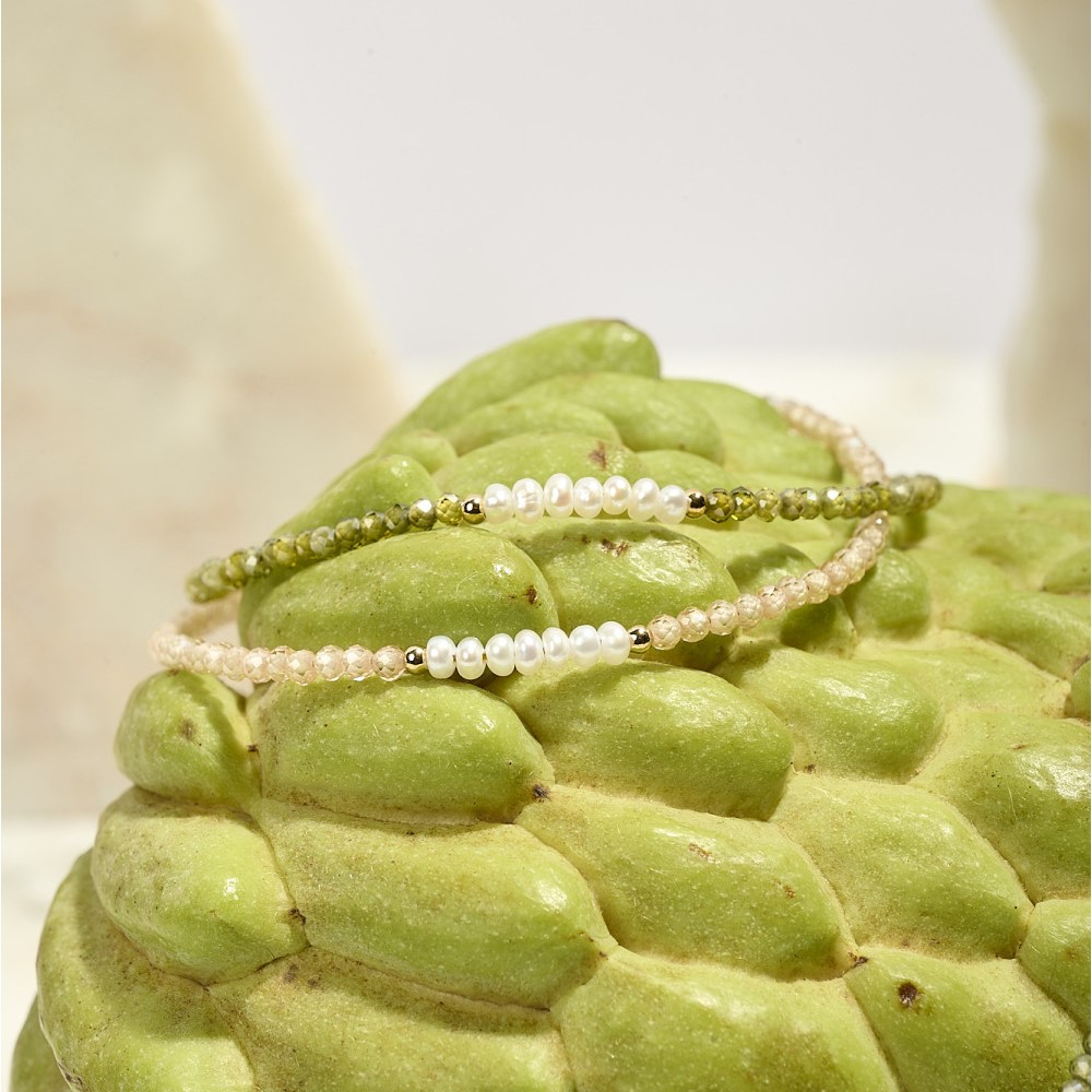 Découvrez le bracelet Rema composé d'un enfilage de perles de culture, de perles en pierre fine et de perles dorées à l'or fin sur un câble.