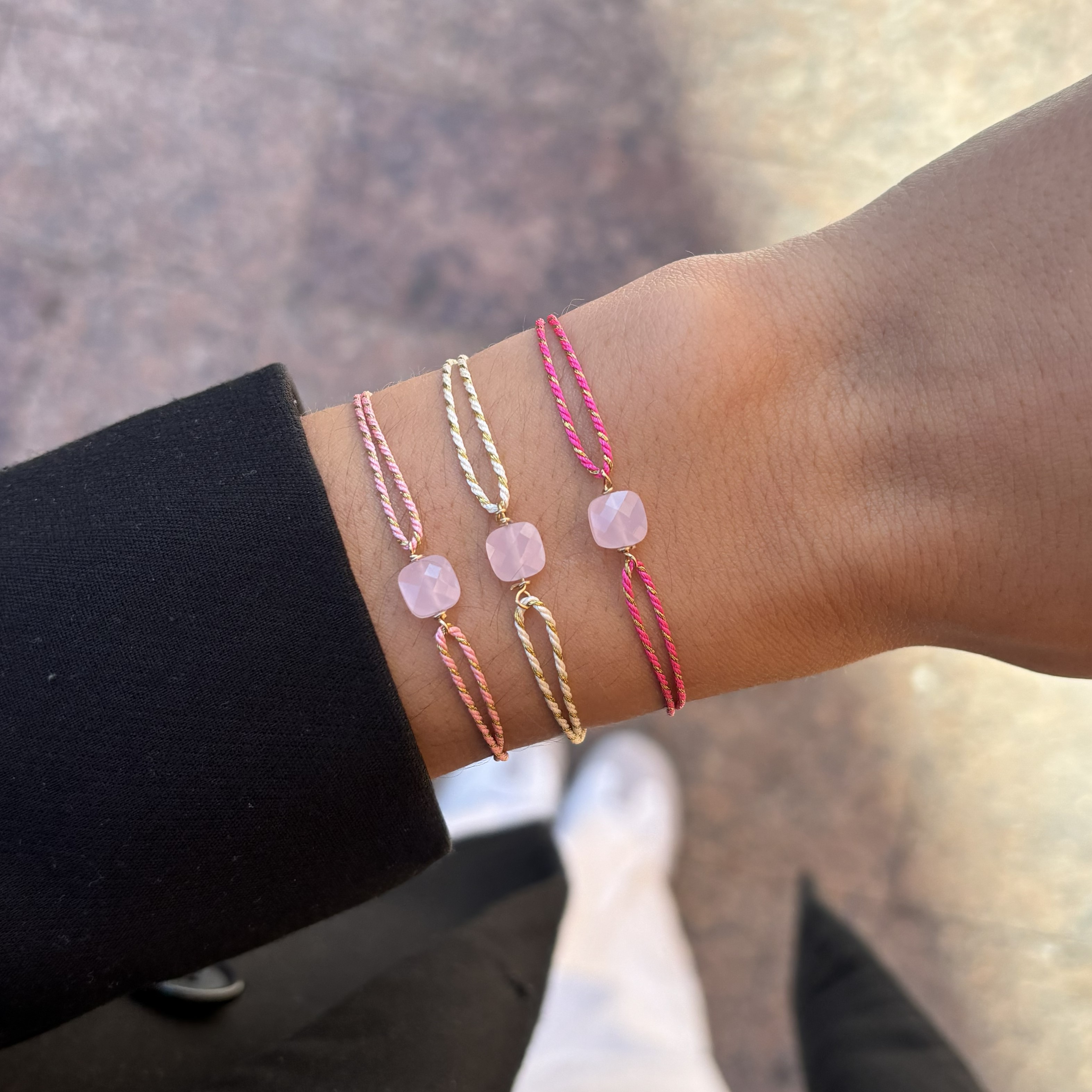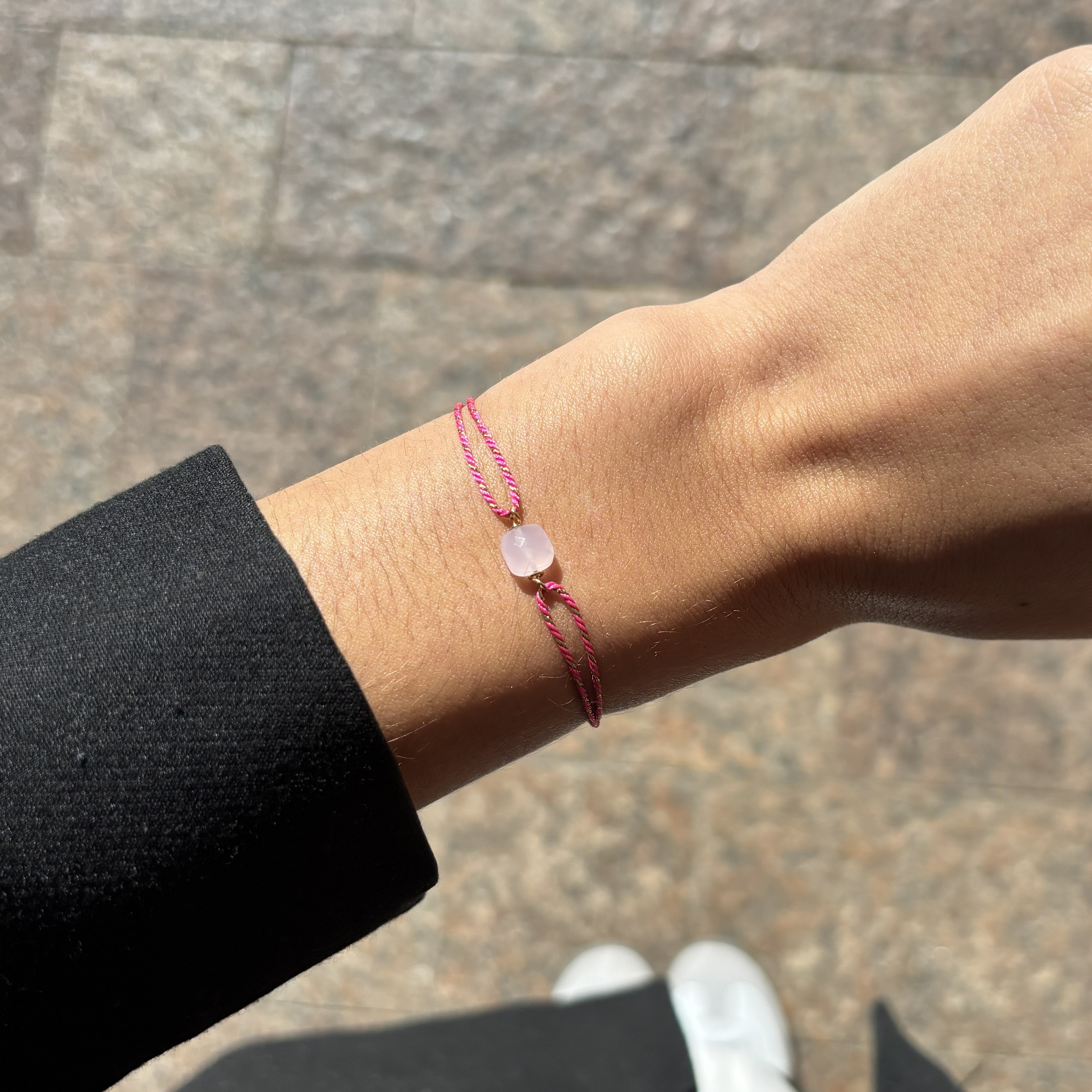 Le bracelet Ruban Rose se compose d'un cordon en polyester et et d'une petite perle de verre rose facettée.