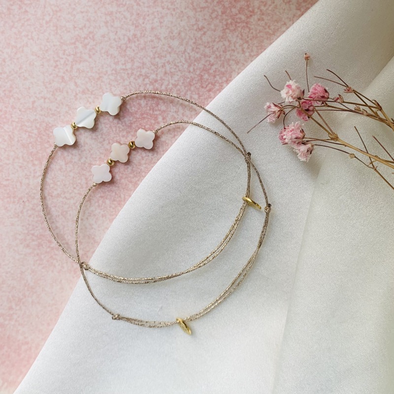 Bracelet trèfle en nacre blanche, séparé par des perles en plaqué or.