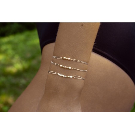 Bracelet sur fil lurex, trois perles d'eau douce roses et petites billes en plaqué or 3 microns